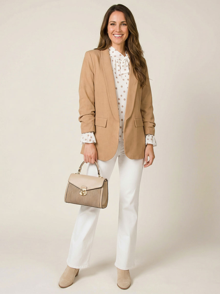 Deze stijlvolle bruine blazer is een perfecte mix van chic en casual. Het openvallende model zorgt voor een elegante, nonchalante uitstraling, terwijl de gesmokte 3/4 mouwen een moderne en speelse touch geven. De blazer is volledig gevoerd, waardoor hij mooi valt en comfortabel aanvoelt. De subtiele schoudervulling geeft net wat extra vorm en zorgt voor een vrouwelijke, krachtige look. Aan de voorkant zijn sierzakken verwerkt die het geheel een klassieke blazer-uitstraling geven. Combineer deze blazer met een jeans en top voor een stijlvolle everyday look of draag ‘m over een jurk voor een elegante outfit. Een veelzijdige musthave die je garderobe compleet maakt!