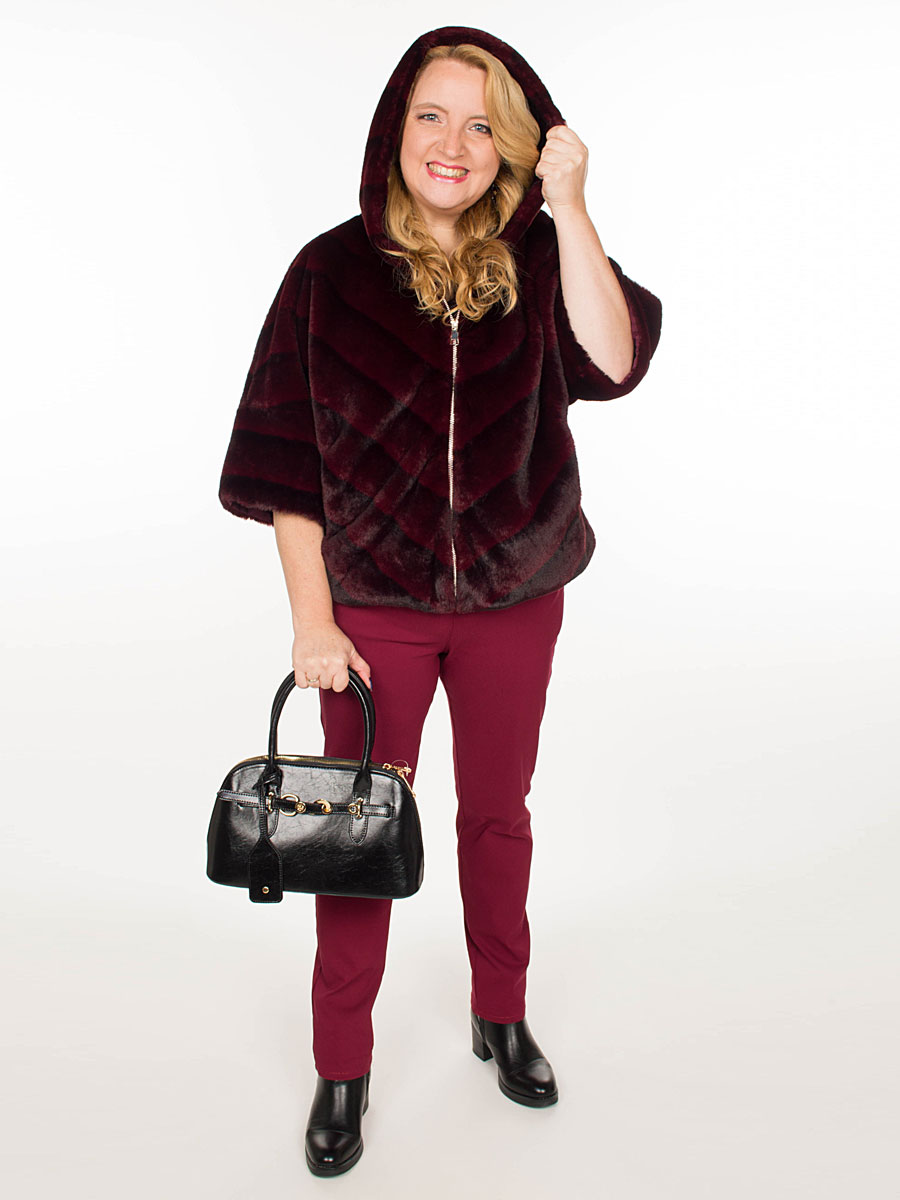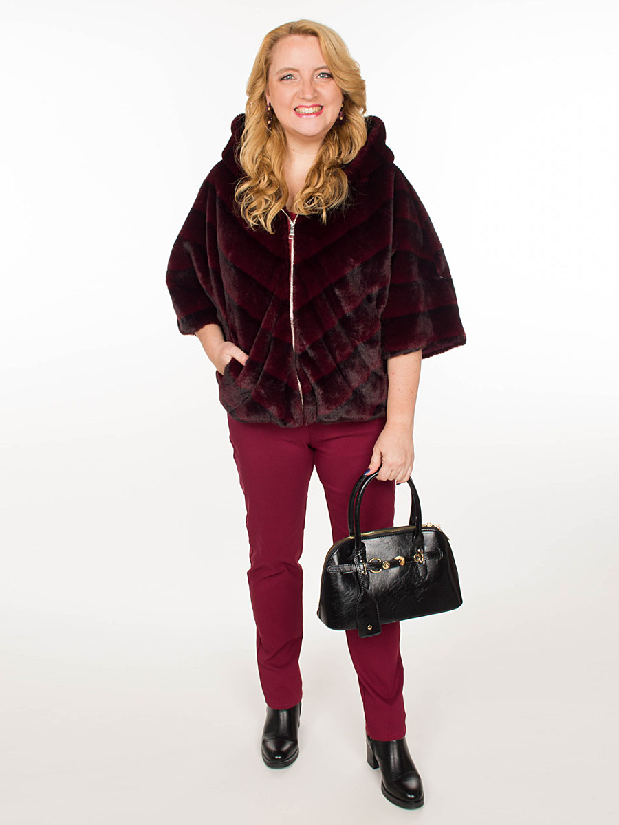 Ga stijlvol en warm de deur uit met deze prachtige faux fur jas in een diepe bordeauxkleur. De jas heeft een luxueuze uitstraling dankzij de zachte, fluweelachtige imitatiebont en de subtiele glans in de stof. De korte, iets wijdere mouwen en de comfortabele pasvorm geven een moderne twist aan deze tijdloze klassieker. De jas is voorzien van een ritssluiting en een elegante capuchon, perfect voor frisse dagen. Combineer hem met een mooie pantalon of jeans en een stijlvolle handtas voor een chique, casual look. De jas is one size en geschikt voor de maten M (38) t/m XXXL (46).