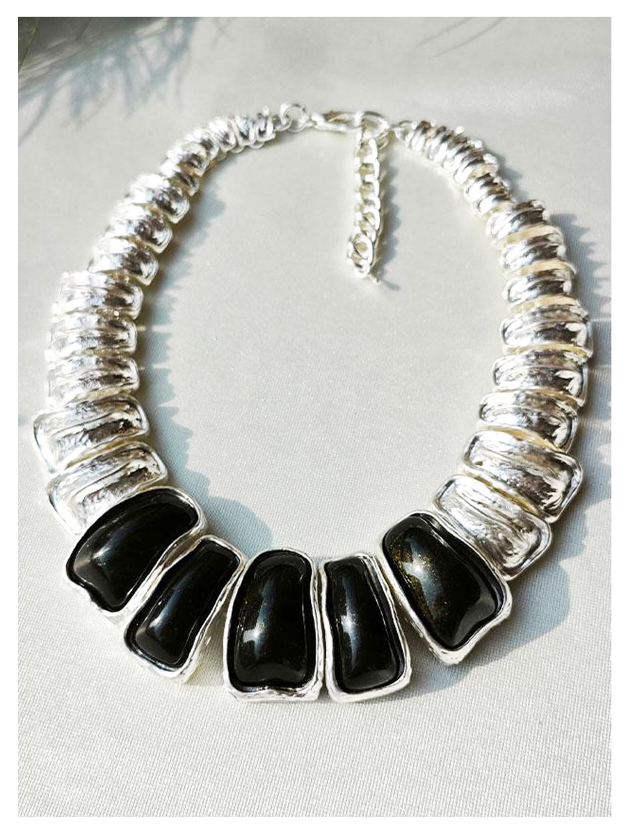 Maak een onvergetelijke indruk met deze adembenemende statement ketting. Dit is meer dan alleen een sieraad; het is een draagbaar kunstwerk dat elke outfit transformeert. De ketting is opgebouwd uit een reeks dikke, zilverkleurige schakels met een ribbelstructuur die zorgen voor een rijke textuur en een luxueuze glans. De blikvanger is het centrale paneel met vijf grote zwarte stenen gevat in een zilveren rand. Het sterke contrast tussen het glanzende zilver en het diepe zwart zorgt voor een krachtige en chique uitstraling. De ketting sluit met een karabijnsluiting en heeft een verlengstuk, zodat je de perfecte pasvorm kunt creëren. Of je nu kiest voor een eenvoudige zwarte coltrui, een elegante avondjurk of een blouse, deze ketting is het perfecte middelpunt.
