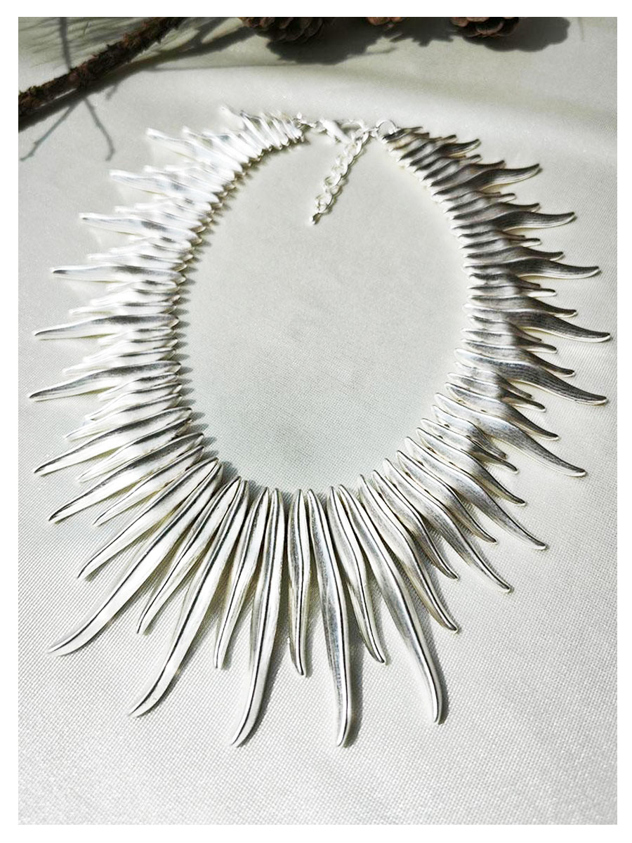 Maak een onvergetelijke indruk met deze adembenemende statement ketting. De ketting is opgebouwd uit zilverkleurige golvende spikes in verschillende lengtes die zorgen voor een speels en vol volume dat de ketting een extra dynamische en opvallende uitstraling geeft. De ketting sluit met een karabijnsluiting en heeft een verlengstuk, zodat je de perfecte pasvorm kunt creëren. Of je nu kiest voor een eenvoudige zwarte coltrui, een elegante avondjurk of een blouse, deze ketting is het perfecte middelpunt.