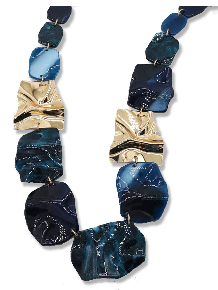 Laat je outfit stralen met deze prachtige statement ketting in blauw tinten. De opvallende, organisch gevormde schakels geven de ketting een artistieke en luxe uitstraling. Deze ketting is perfect om een simpele outfit direct een stijlvolle upgrade te geven. Draag het bij een effen jurk, een chique blouse of juist een casual trui — met deze eyecatcher maak je altijd indruk. Dankzij de verstelbare sluiting draag je de ketting precies op de gewenste lengte.