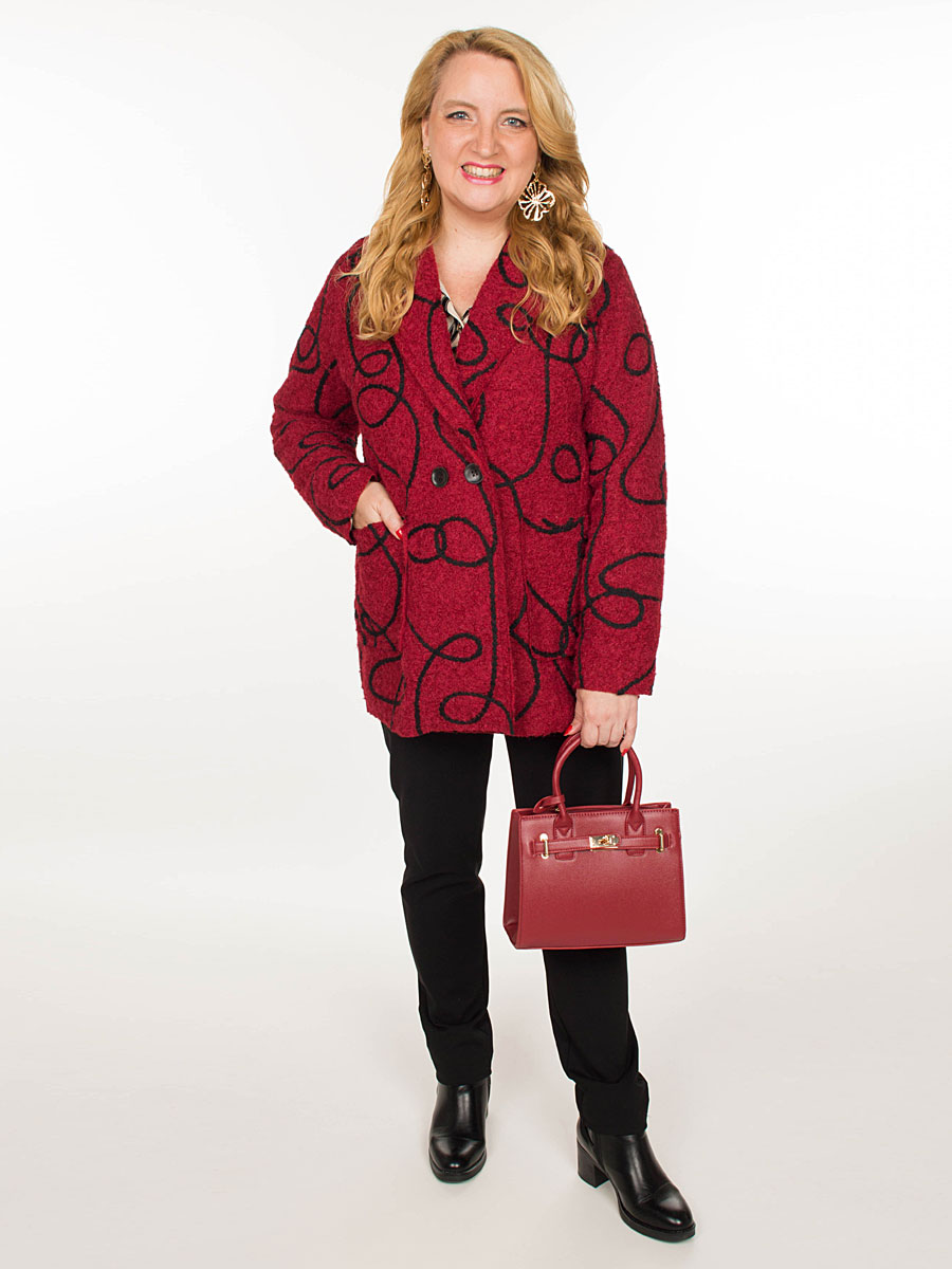 Geef je outfit een modieuze upgrade met deze elegante bouclé jas. Uitgevoerd in bordeaux met een speels zwart lusjespatroon is dit een echte eyecatcher. De dubbelrijige knoopsluiting en klassieke reverskraag zorgen voor een chique uitstraling, terwijl de zachte bouclé stof comfortabel aanvoelt. Perfect te combineren met zowel casual als stijlvolle looks. De jas is one size en geschikt voor de maten M (38) t/m XXXL (46).