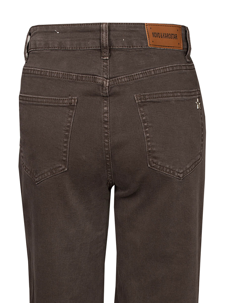 Deze trendy bruine spijkerbroek met straight fit en wide leg draagt heerlijk door zijn stretch.