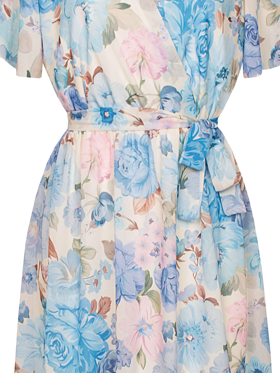 Deze stijlvolle jurk is een echte eyecatcher. De blauwe bloemenprint geeft de jurk een fleurige en modieuze uitstraling. De V-hals met overslag en de elastische taille met strikceintuur zorgen voor een mooi silhouet en benadrukken de vrouwelijke vormen op een flatterende manier. De zwierige korte mouwtjes geven een elegante en luchtige uitstraling, terwijl het rokgedeelte soepel valt en is voorzien van een comfortabel onderrokje. De top is aan de voorkant gevoerd, zodat de stof niet doorschijnt en je je de hele dag zelfverzekerd voelt. Ideaal voor zowel een feestelijke gelegenheid maar ook als stijlvolle dagelijkse outfit.