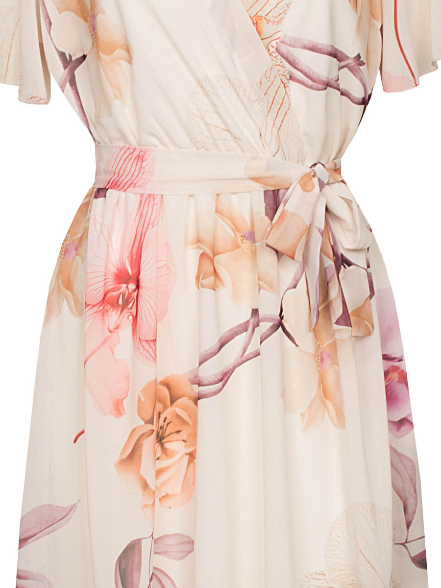 Deze stijlvolle jurk is een echte eyecatcher. De bloemenprint geeft de jurk een fleurige en modieuze uitstraling. De V-hals met overslag en de elastische taille met strikceintuur zorgen voor een mooi silhouet en benadrukken de vrouwelijke vormen op een flatterende manier. De zwierige korte mouwtjes geven een elegante en luchtige uitstraling, terwijl het rokgedeelte soepel valt en is voorzien van een comfortabel onderrokje. De top is aan de voorkant gevoerd, zodat de stof niet doorschijnt en je je de hele dag zelfverzekerd voelt. Ideaal voor zowel een feestelijke gelegenheid maar ook als stijlvolle dagelijkse outfit.