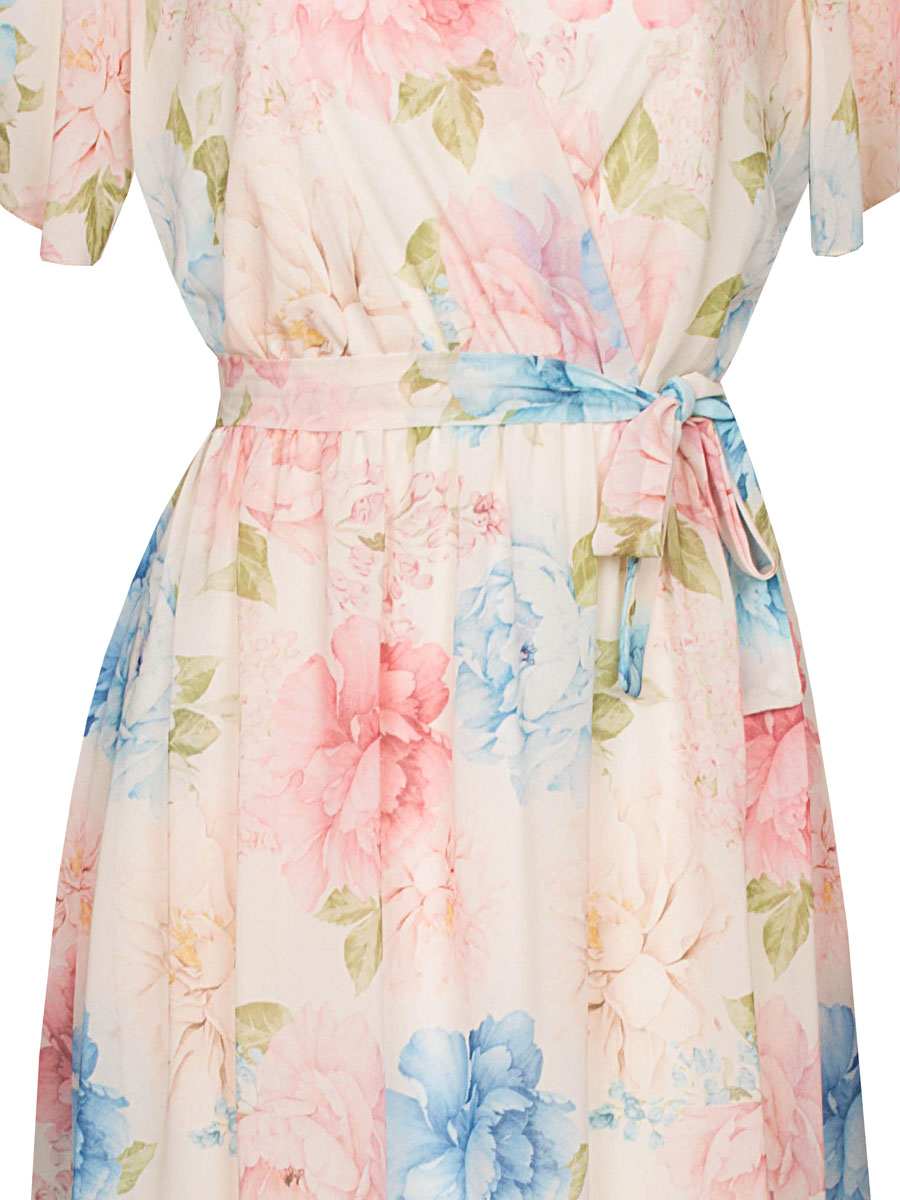 Deze stijlvolle jurk in pastel roze en blauw is een echte eyecatcher. De bloemenprint geeft de jurk een fleurige en modieuze uitstraling. De V-hals met overslag en de elastische taille met strikceintuur zorgen voor een mooi silhouet en benadrukken de vrouwelijke vormen op een flatterende manier. De zwierige korte mouwtjes geven een elegante en luchtige uitstraling, terwijl het rokgedeelte soepel valt en is voorzien van een comfortabel onderrokje. De top is aan de voorkant gevoerd, zodat de stof niet doorschijnt en je je de hele dag zelfverzekerd voelt. Ideaal voor zowel een feestelijke gelegenheid maar ook als stijlvolle dagelijkse outfit.
