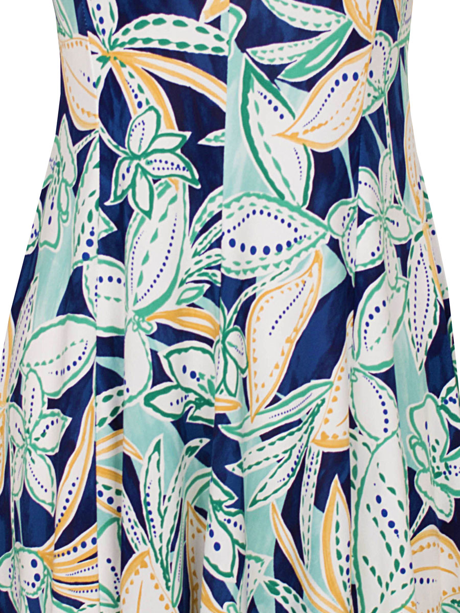 Deze blauwe jurk met gele en groene, bloemen- en bladerenprint is een echte eyecatcher. De kleuren en speelse print geven de jurk een frisse, zomerse uitstraling die perfect past bij zowel een casual dag als een iets gekledere gelegenheid. De jurk is gemaakt van een soepele stretchstof die heerlijk draagt en mooi met je lichaam meebeweegt. Het model is in banen gestikt en heeft een A-lijn pasvorm die naar onderen toe wijder uitloopt, wat zorgt voor een zwierig en flatterend silhouet. De subtiele naad middenvoor geeft de jurk een extra verfijnd detail en draagt bij aan een slanke uitstraling. De V-hals maakt de look vrouwelijk en elegant.