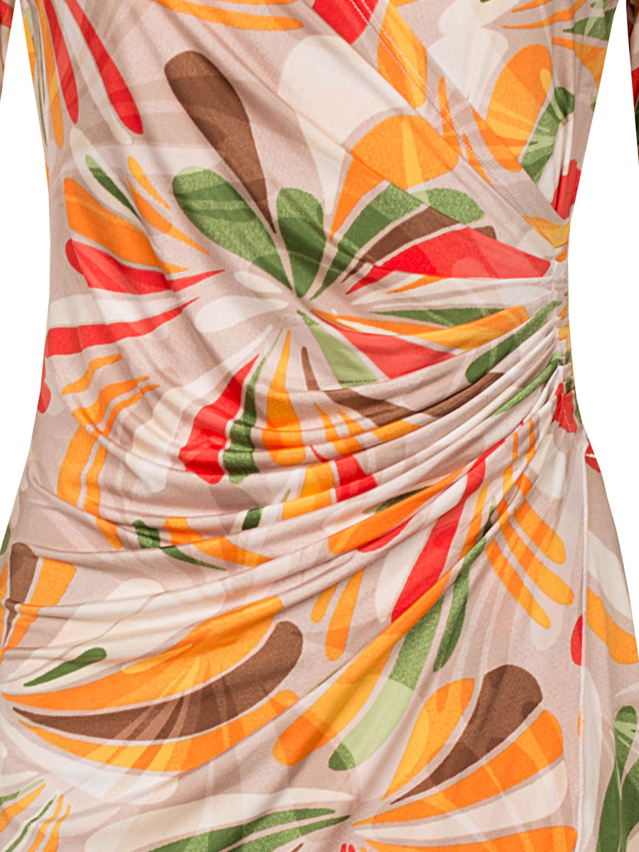 Deze jurk met 3/4 mouwlengte is het model "Cross dress" van het merk Kingdom of Heaven. Straal in deze prachtige jurk met grafische bladerprint in fris gekleurde tinten. Perfect voor zowel een werkdag als een feestje, in deze jurk zie je er altijd stijlvol uit. De jurk is gemaakt van een soepelvallende stof met stretch. Hierdoor sluit hij mooi aan op het lichaam en biedt hij tegelijkertijd optimaal draagcomfort. De vaste overslag aan de voorkant en de speelse plooien in de taille zorgen voor een flatterend silhouet en een elegant, vrouwelijk effect.