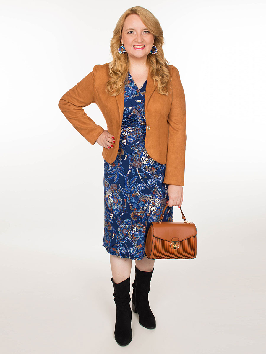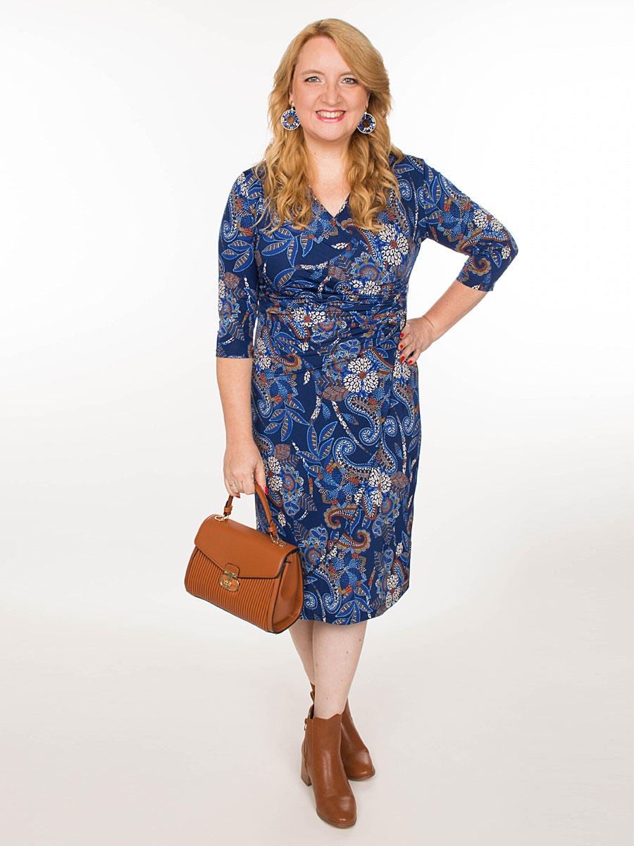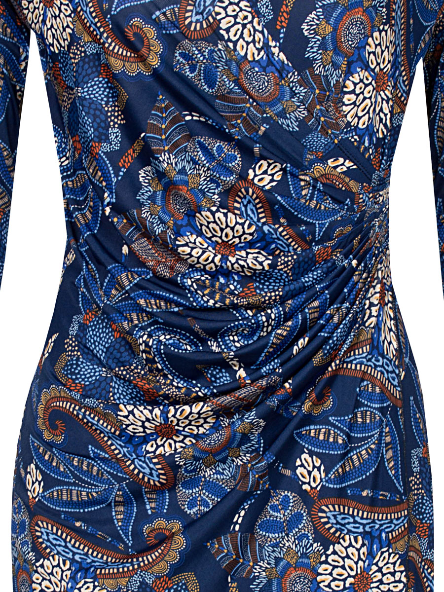 Deze navykleurige jurk met 3/4 mouwlengte van het merk Kingdom of Heaven en model "Cross dress" heeft een bloemen en bladerenprint in blauw en bruintinten. De jurk draagt heerlijk door de soepelvallende stof met stretch, sluit mooi aan en de plooiingen en vaste overslag aan de voorkant geven een speels effect. Deze jurk is van travelstof en dát is ideaal: heerlijk draagcomfort door de stretch, kreukvrij en na de was snel droog.