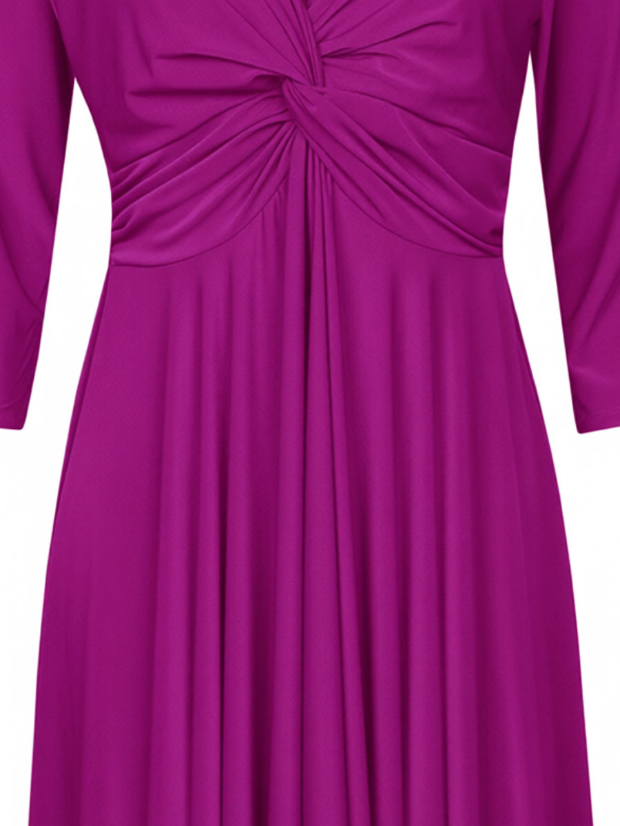 Deze prachtige aubergine jurk van soepele stretch travelstof valt mooi om het lichaam en zorgt voor optimaal draagcomfort, terwijl de vrouwelijke twist aan de voorkant een flatterend effect geeft op de taille. De V-hals en de ¾-mouwen maken het model tijdloos en geschikt voor elk seizoen. De zwierige A-lijn jurk valt elegant en beweegt sierlijk mee bij elke stap die je zet. Perfect voor een feestelijke gelegenheid, een diner of voor een stijlvolle kantooroutfit.