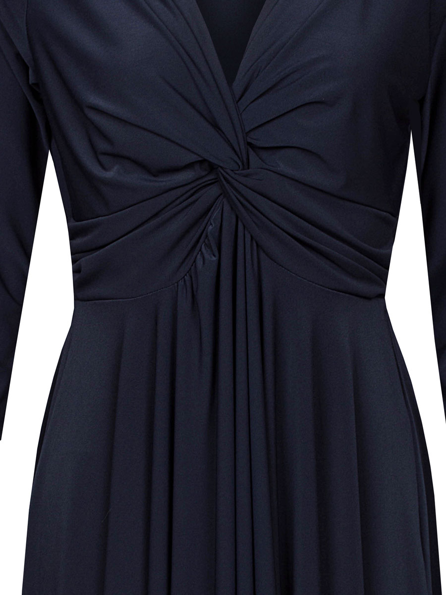 Deze prachtige donkerblauwe jurk van soepele stretch travelstof valt mooi om het lichaam en zorgt voor optimaal draagcomfort, terwijl de vrouwelijke twist aan de voorkant een flatterend effect geeft op de taille. De V-hals en de ¾-mouwen maken het model tijdloos en geschikt voor elk seizoen. De zwierige A-lijn jurk valt elegant en beweegt sierlijk mee bij elke stap die je zet. Perfect voor een feestelijke gelegenheid, een diner of voor een stijlvolle kantooroutfit.