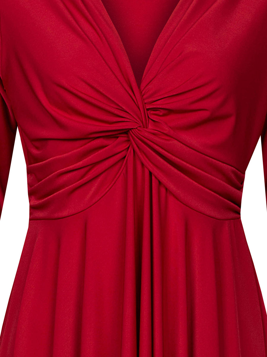 Deze prachtige rode jurk van soepele stretch travelstof valt mooi om het lichaam en zorgt voor optimaal draagcomfort, terwijl de vrouwelijke twist aan de voorkant een flatterend effect geeft op de taille. De V-hals en de ¾-mouwen maken het model tijdloos en geschikt voor elk seizoen. De zwierige A-lijn jurk valt elegant en beweegt sierlijk mee bij elke stap die je zet. Perfect voor een feestelijke gelegenheid, een diner of voor een stijlvolle kantooroutfit.