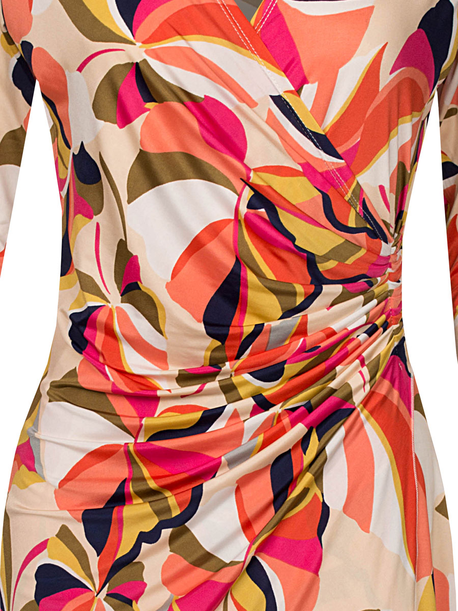 Deze jurk met 3/4 mouwlengte is model "Cross dress" van het merk Kingdom of Heaven. De prachtige, kleurrijke print geeft deze jurk een vrouwelijke en moderne uitstraling. Perfect voor zowel een werkdag als een feestje – met deze jurk zie je er altijd stijlvol uit. De jurk is gemaakt van een soepelvallende stof met stretch. Hierdoor sluit hij mooi aan op het lichaam en biedt hij tegelijkertijd optimaal draagcomfort. De vaste overslag aan de voorkant en de speelse plooien in de taille zorgen voor een flatterend silhouet en een elegant, vrouwelijk effect.