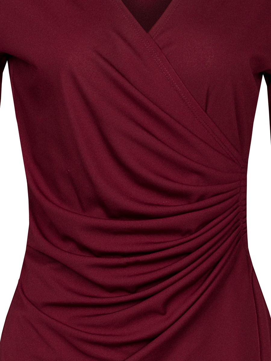 Deze bordeaux jurk met 3/4 mouw van het merk Kingdom of Heaven draagt heerlijk door zijn stretch. De jurk sluit mooi aan en de plooiingen en vaste overslag aan de voorkant geven een speels effect. Deze cross dress is 10 cm langer dan onze standaard lengte van dit model.