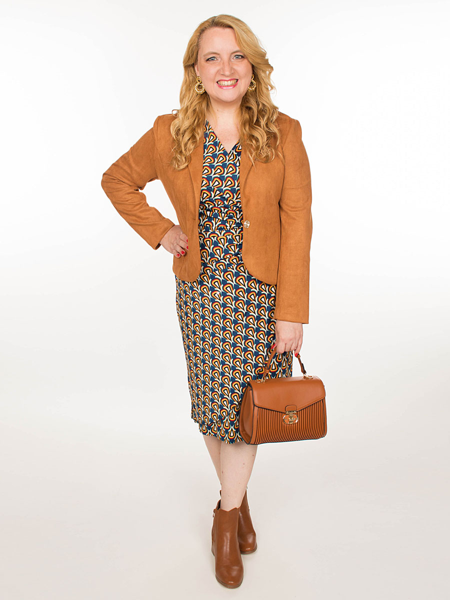 Details: grafische print, stretch, plooïingen voor en een vaste overslag van onderen, 3/4 mouw