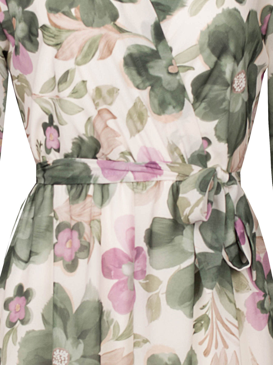 Deze stijlvolle jurk is een echte eyecatcher. De bloemmotieven in groen en lila geven de jurk een luxe, modieuze uitstraling. De V-hals met overslag en de elastische taille met strikceintuur zorgen voor een mooi silhouet en benadrukken de vrouwelijke vormen op een flatterende manier. De jurk heeft lange, licht doorschijnende mouwen met elastiek bij de pols. Het zwierige rokgedeelte heeft een onderrokje met een subtiele volant aan de onderkant. Dit geeft de jurk een elegante, maar ook speelse look. Ideaal voor zowel een feestelijke gelegenheid maar ook als stijlvolle dagelijkse outfit.