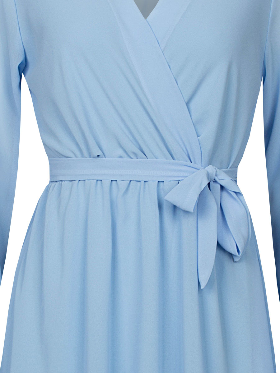 Deze stijlvolle jurk is een echte eyecatcher. Het lichtblauwe geeft de jurk een luxe, modieuze uitstraling. De V-hals met overslag en de elastische taille met strikceintuur zorgen voor een mooi silhouet en benadrukken de vrouwelijke vormen op een flatterende manier. De jurk heeft lange, licht doorschijnende mouwen met elastiek bij de pols. Het zwierige rokgedeelte heeft een onderrokje met een subtiele volant aan de onderkant. Dit geeft de jurk een elegante, maar ook speelse look. Ideaal voor zowel een feestelijke gelegenheid als een stijlvolle dagelijkse outfit.