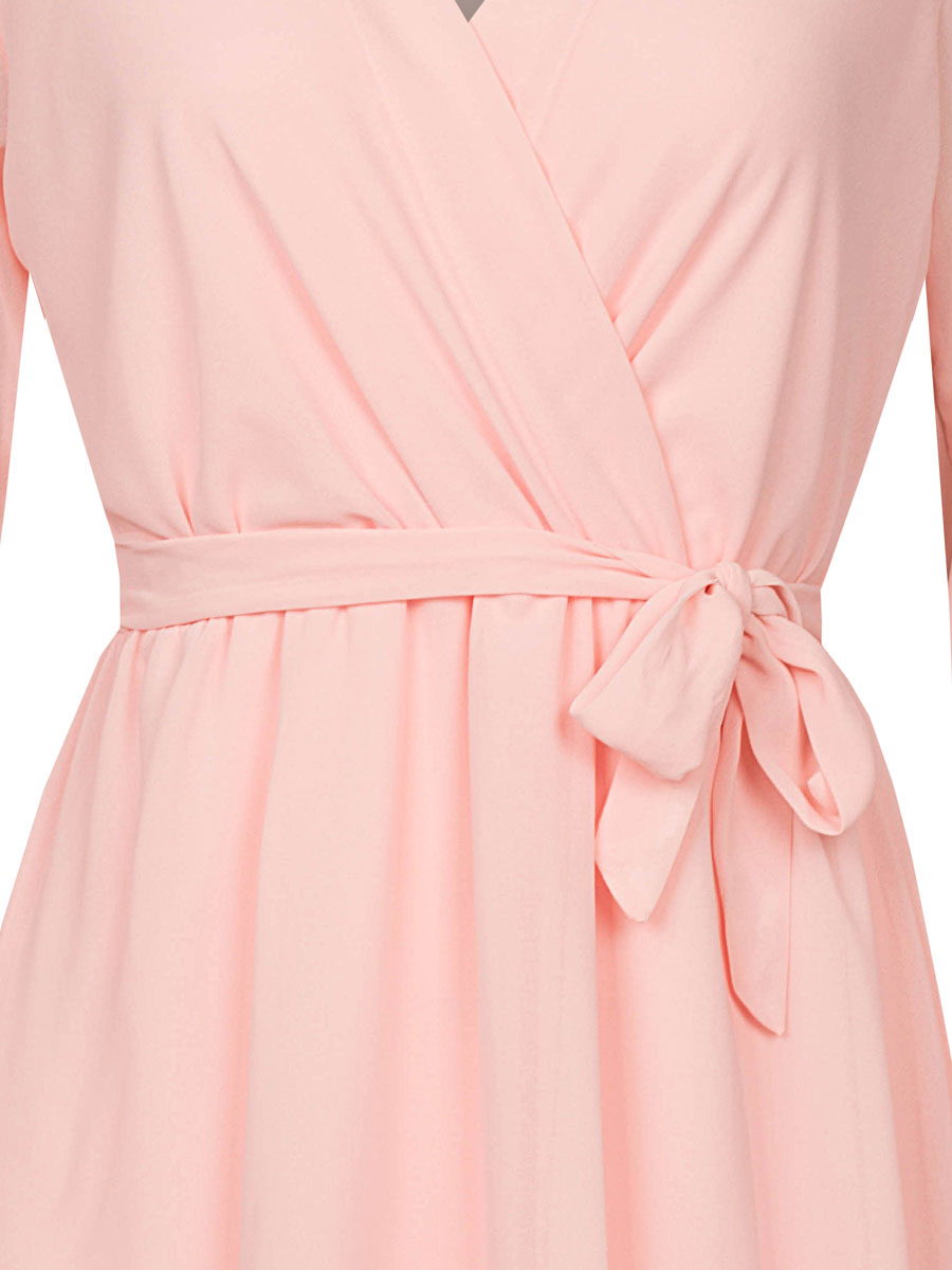 Deze stijlvolle jurk is een echte eyecatcher. Het lichtroze geeft de jurk een luxe, modieuze uitstraling. De V-hals met overslag en de elastische taille met strikceintuur zorgen voor een mooi silhouet en benadrukken de vrouwelijke vormen op een flatterende manier. De jurk heeft lange, licht doorschijnende mouwen met elastiek bij de pols. Het zwierige rokgedeelte heeft een onderrokje met een subtiele volant aan de onderkant. Dit geeft de jurk een elegante, maar ook speelse look. Ideaal voor zowel een feestelijke gelegenheid maar ook als stijlvolle dagelijkse outfit.