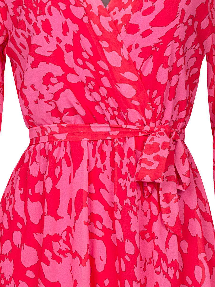 Deze stijlvolle jurk is een echte eyecatcher. De grafische print met roze en rood geeft de jurk modieuze uitstraling. De V-hals met overslag en de elastische taille met strikceintuur zorgen voor een mooi silhouet en benadrukken de vrouwelijke vormen op een flatterende manier. De jurk heeft lange, licht doorschijnende mouwen met elastiek bij de pols. Het zwierige rokgedeelte heeft een onderrokje met een subtiele volant aan de onderkant. Dit geeft de jurk een elegante, maar ook speelse look. Ideaal voor zowel een feestelijke gelegenheid als een stijlvolle dagelijkse outfit.