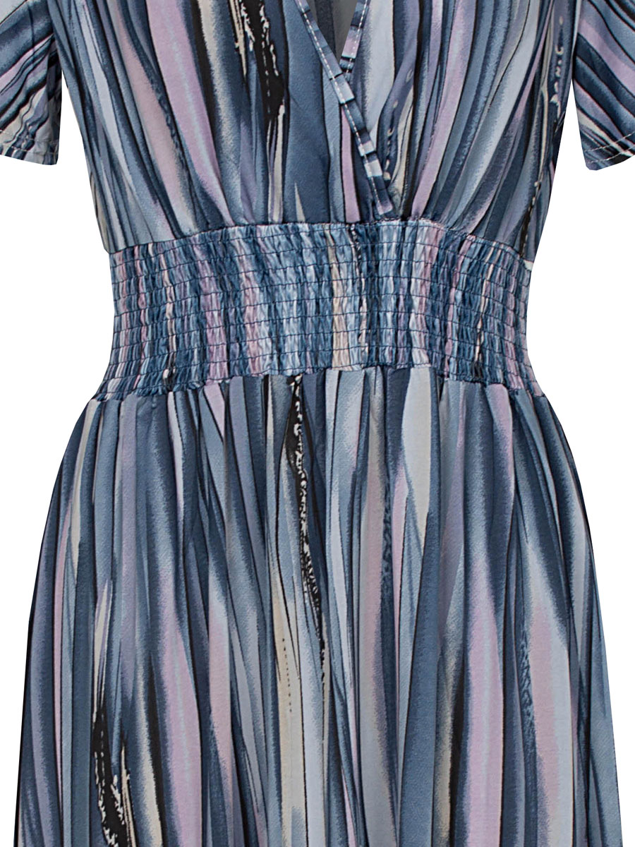 Deze blauwe jurk is van het model "Perfect Fit", een échte musthave jurk. Dit model jurk heeft namelijk een perfecte pasvorm bij ieder figuurtype door de brede elastische taille die mooi aansluit. De jurk is van travelstof en dát is ideaal: heerlijk draagcomfort door de stretch, kreukvrij en na de was snel droog. Deze zomerjurk heeft korte mouwen en een mooi strepenprint.