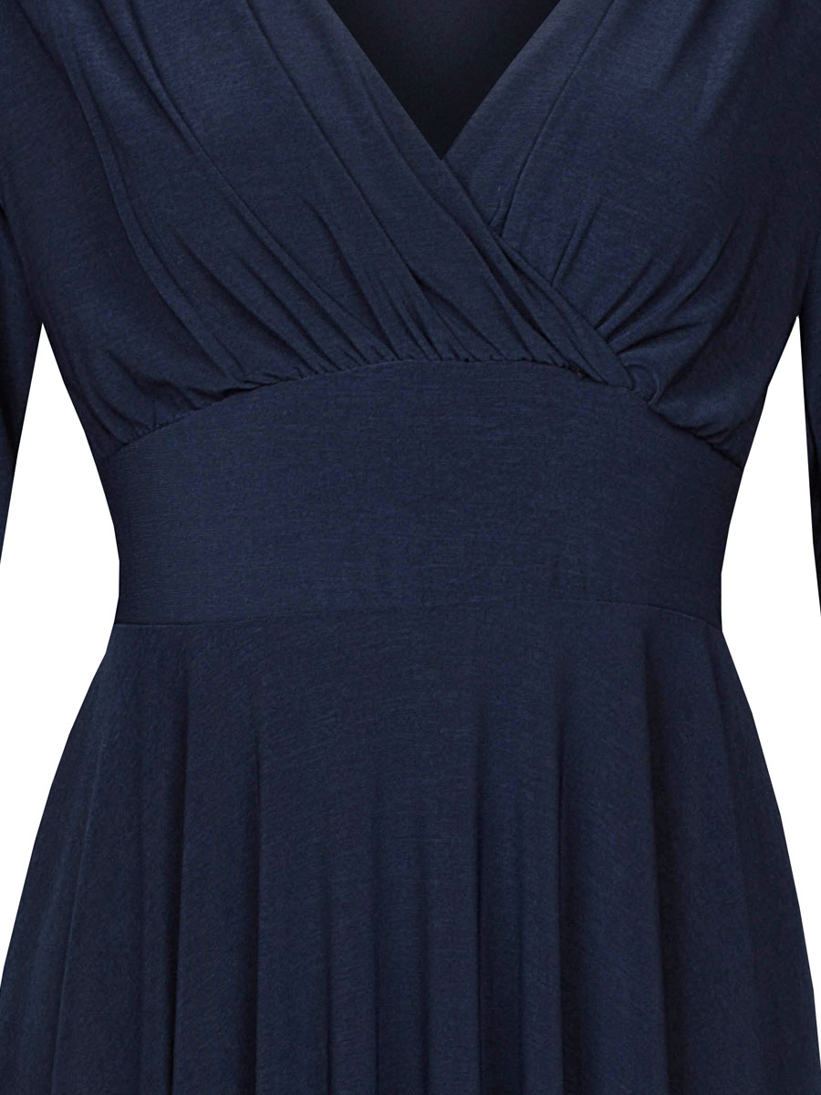 Deze prachtige donkerblauwe jurk van soepele stretch travelstof valt mooi om het lichaam en zorgt voor optimaal draagcomfort. Dankzij de brede elastische tailleband ontstaat een vrouwelijk silhouet dat mooi aansluit zonder te knellen. De V-hals en de ¾-mouwen maken het model tijdloos en geschikt voor elk seizoen. De zwierige A-lijn jurk valt elegant en beweegt sierlijk mee bij elke stap die je zet. Perfect voor een feestelijke gelegenheid, een diner of voor een stijlvolle kantooroutfit.