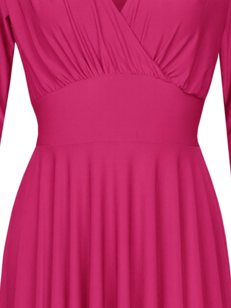 Deze prachtige roze jurk van soepele stretch travelstof valt mooi om het lichaam en zorgt voor optimaal draagcomfort. Dankzij de brede elastische tailleband ontstaat een vrouwelijk silhouet dat mooi aansluit zonder te knellen. De V-hals en de ¾-mouwen maken het model tijdloos en geschikt voor elk seizoen. De zwierige A-lijn jurk valt elegant en beweegt sierlijk mee bij elke stap die je zet. Perfect voor een feestelijke gelegenheid, een diner of voor een stijlvolle kantooroutfit.