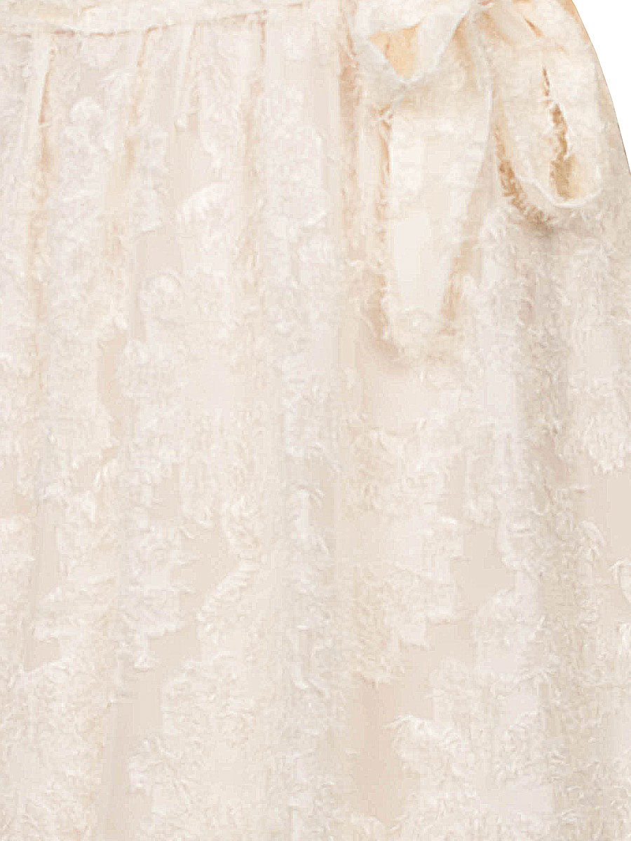 Deze elegante korte jurk is een echte blikvanger voor feestelijke gelegenheden. De ecrukleurige transparante stof is verrijkt met een bijzonder patroon waarbij kleine draadjes subtiel uit de stof steken. Dit geeft de jurk een speels reliëf en een luxe uitstraling. De V-hals met overslag en de elastische taille met strikceintuur zorgen voor een mooi silhouet en benadrukken de vrouwelijke vormen op een flatterende manier. De lange, licht doorschijnende mouwen zijn afgewerkt met elastiek bij de polsen, wat zorgt voor een comfortabele en verfijnde pasvorm. Het zwierige rokgedeelte valt soepel en is voorzien van een onderrokje, zodat de jurk mooi draagt en niet doorschijnt. Perfect voor een feest, diner of speciale gelegenheid waarbij je er stijlvol en vrouwelijk uit wilt zien.