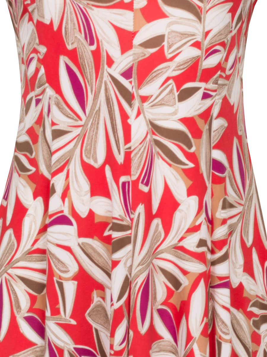 Deze rode jurk met bladerenprint is een echte eyecatcher. De kleuren en speelse print geven de jurk een frisse, zomerse uitstraling die perfect past bij zowel een casual dag als een iets gekledere gelegenheid. De jurk is gemaakt van een soepele stretchstof die heerlijk draagt en mooi met je lichaam meebeweegt. Het model is in banen gestikt en heeft een A-lijn pasvorm die naar onderen toe wijder uitloopt, wat zorgt voor een zwierig en flatterend silhouet. De subtiele naad middenvoor geeft de jurk een extra verfijnd detail en draagt bij aan een slanke uitstraling. De V-hals maakt de look vrouwelijk en elegant.