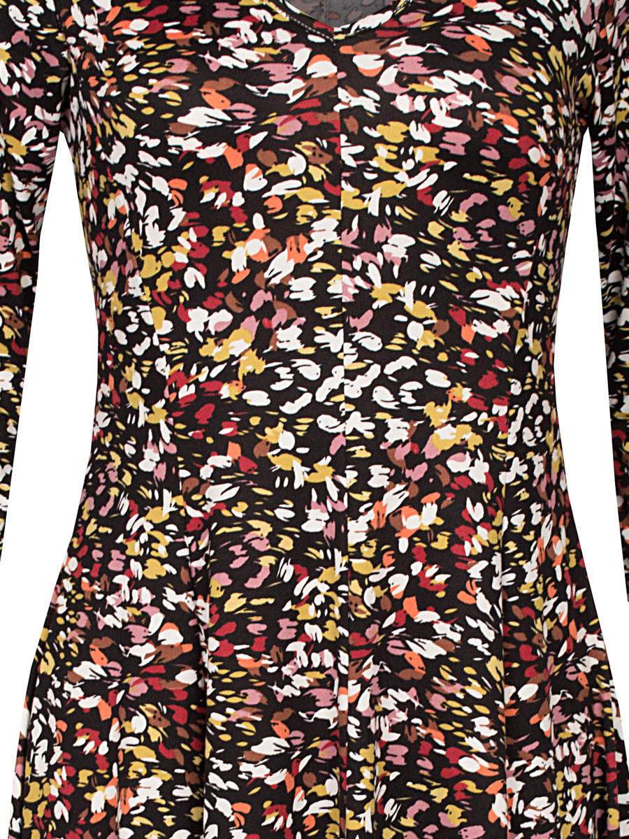 Voel je vrouwelijk en comfortabel in deze prachtige A-lijn jurk met een speelse all-over print. De jurk is in banen gestikt en gemaakt van een zachte, soepele stretchstof die heerlijk aanvoelt op de huid en mooi met je meebeweegt. Dankzij de driekwart mouwen en de v-halslijn heeft deze jurk een flatterend silhouet dat geschikt is voor elk seizoen. De uitlopende jurk valt elegant om het lichaam en zorgt voor een sierlijke, zwierige look bij elke stap.