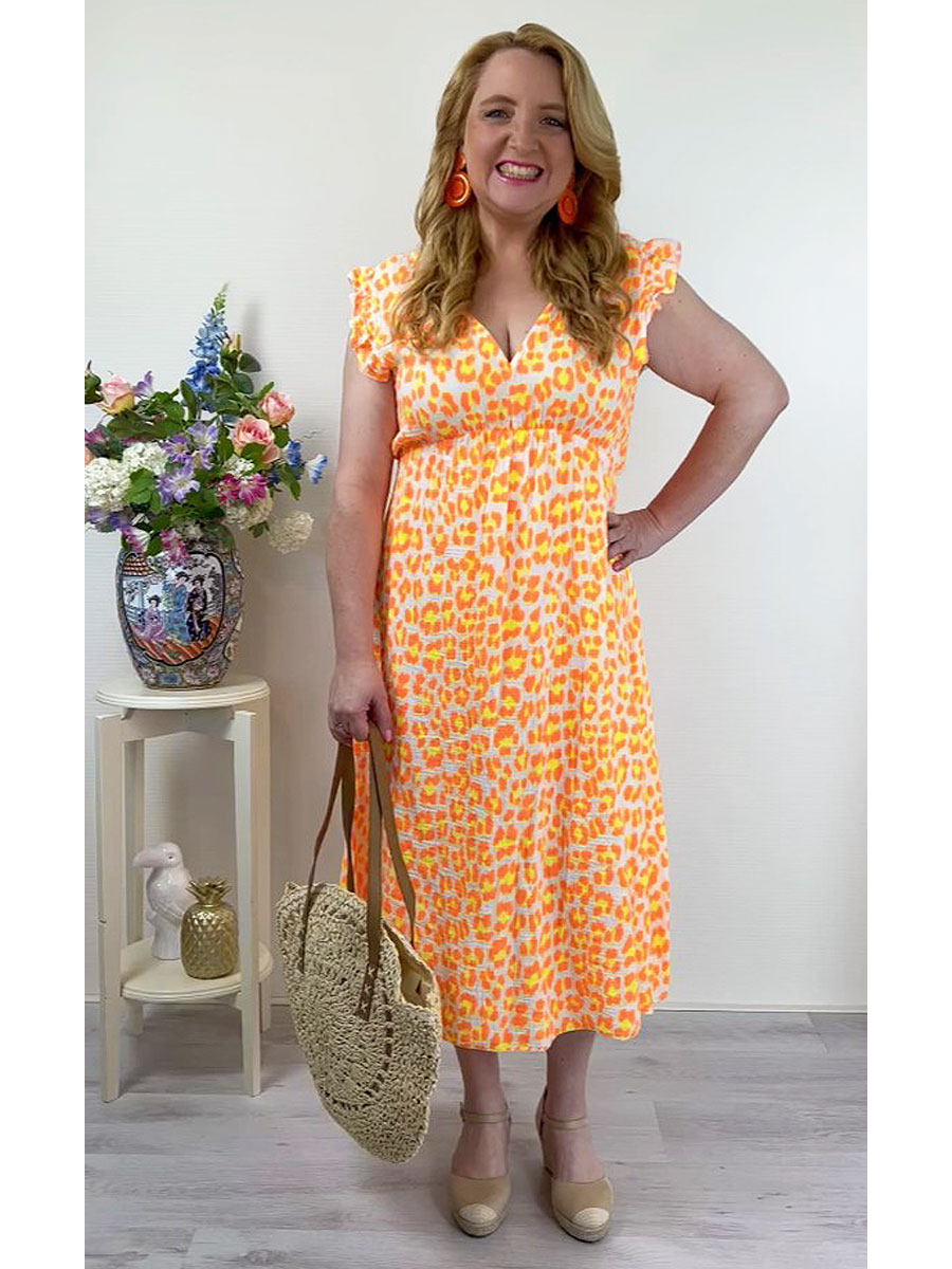 Laat je van je meest kleurrijke kant zien met deze zomerse musthave jurk! De felle oranje en gele panterprint maakt het tot een échte eyecatcher voor zonnige dagen en vrolijke gelegenheden. De jurk heeft een flatterende V-hals, speelse ruffle mouwtjes en een elastische taille die zorgt voor een vrouwelijke pasvorm. Gemaakt van luchtig en soepelvallend katoen dat heerlijk draagt op warme dagen. Of je nu een terrasje pakt, een dagje uit gaat of een zomers feestje op de planning hebt – met deze jurk zit je altijd goed.