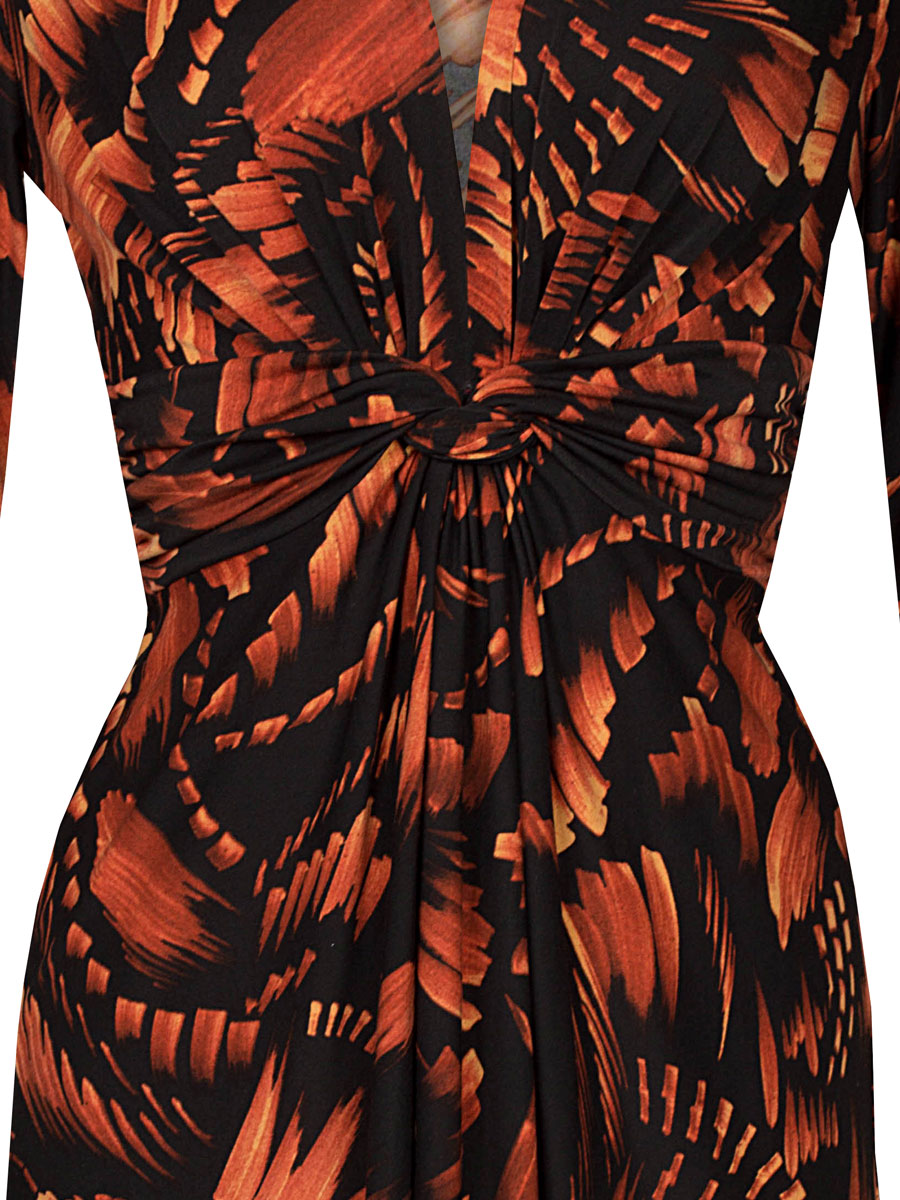 Deze zwarte jurk met mooie bruine print van het merk Kingdom of Heaven met 3/4 mouwlengte ziet er elegant uit. De jurk valt mooi door de stretch en de plooiingen bij de borst en middenvoor die een speels effect geven en meer ruimte als dat nodig is. Een vast ceintuur die je aan de achterzijde strikt geeft de finishing touch aan deze fraaie jurk. Deze jurk is van het model "Elegant" en uitgevoerd in de kortere standaard lengte van dit model.