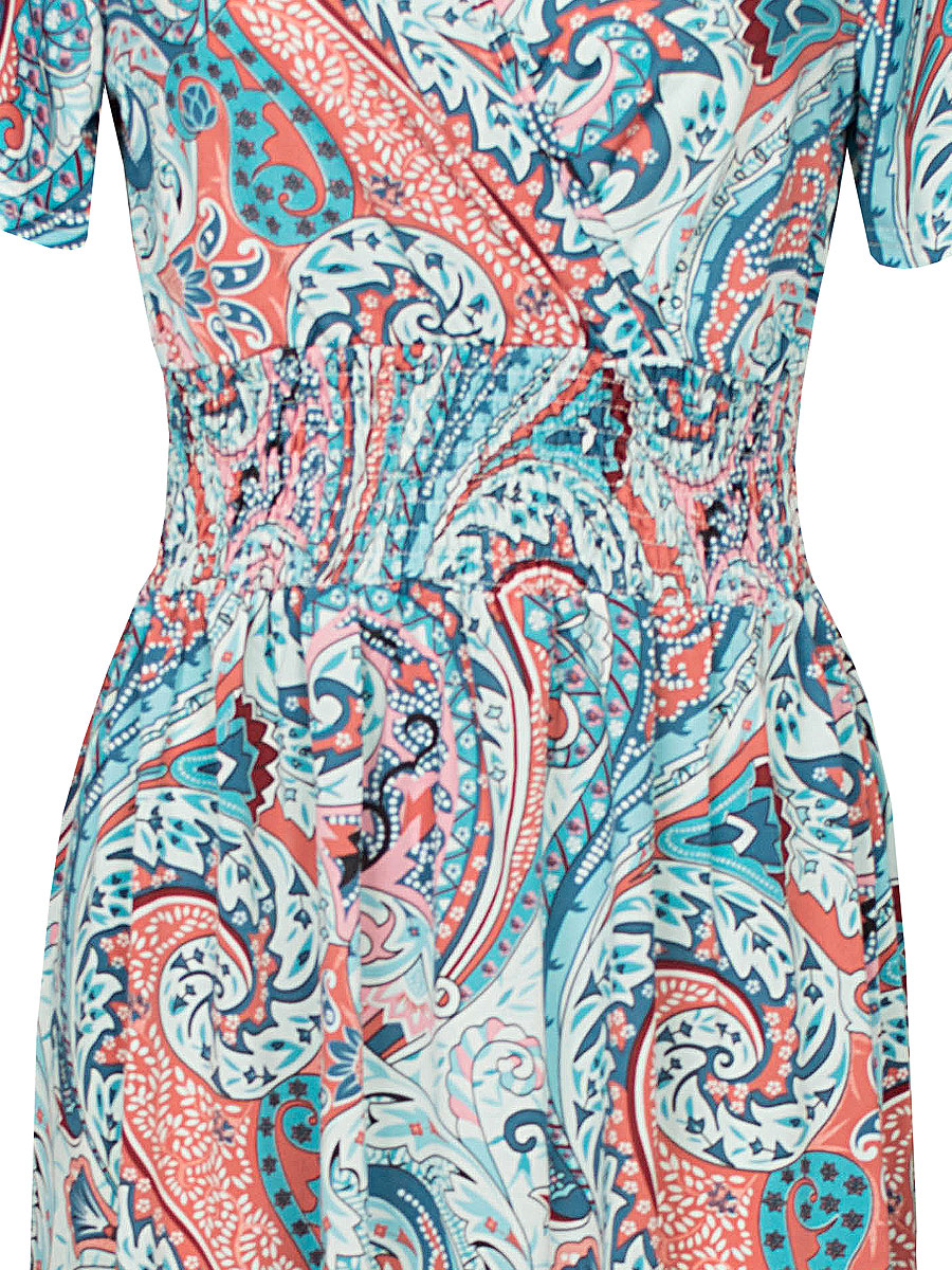 Deze blauwe jurk is van het model "Perfect Fit", een échte musthave jurk. Dit model jurk heeft namelijk een perfecte pasvorm bij ieder figuurtype door de brede elastische taille die mooi aansluit. De jurk is van travelstof en dát is ideaal: heerlijk draagcomfort door de stretch, kreukvrij en na de was snel droog. Deze zomerjurk heeft korte mouwen en een mooi paisleyprint.
