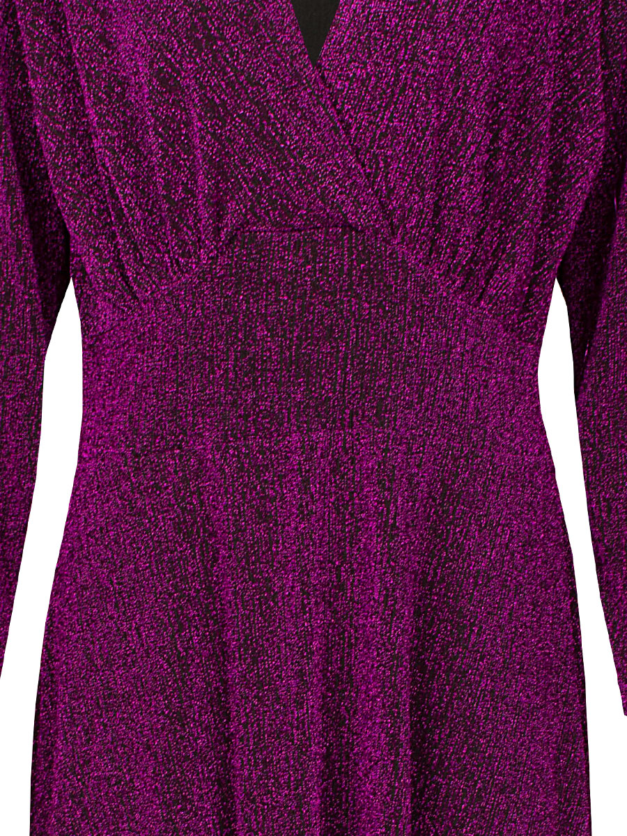Details: paarse glitterdraad, stretch, plooïingen voor, diepe V-hals
