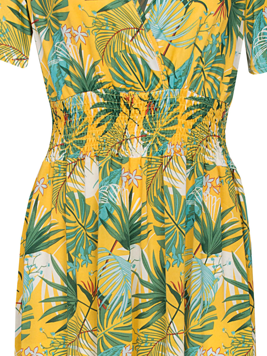 Deze gele maxi jurk is van het model "Perfect Fit", een échte musthave jurk. Dit model jurk heeft namelijk een perfecte pasvorm bij ieder figuurtype door de brede elastische taille die mooi aansluit. De jurk is van travelstof en dát is ideaal: heerlijk draagcomfort door de stretch, kreukvrij en na de was snel droog. Deze zomerjurk heeft korte mouwen en een mooie tropische bladerenprint met groen, blauw en wit-accenten, dit maakt het combineren makkelijk.