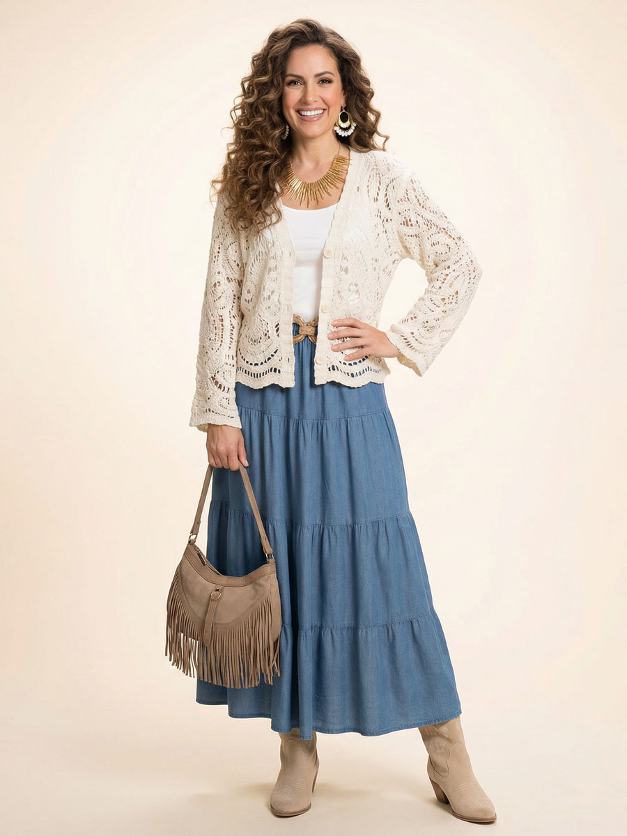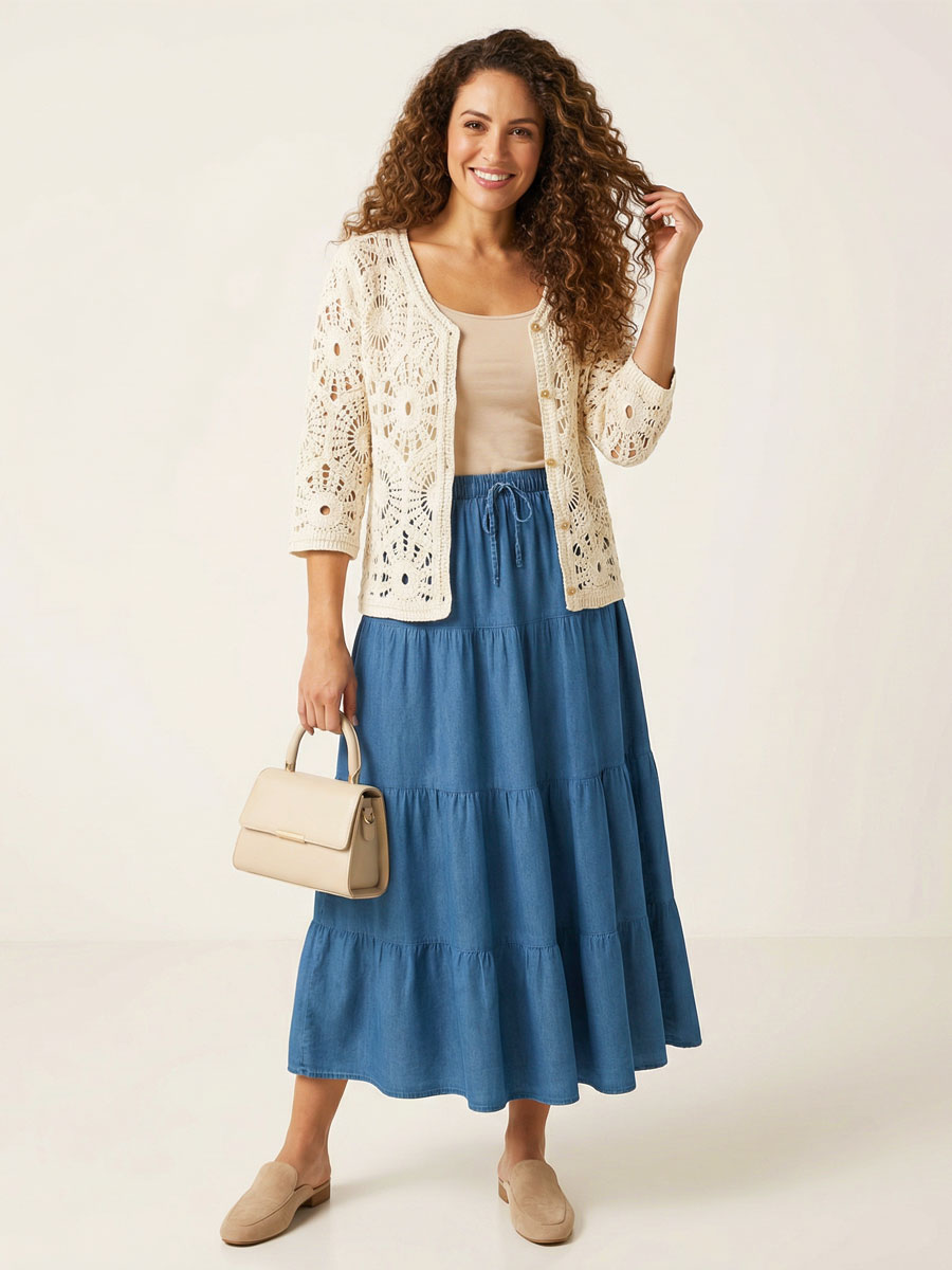 Deze prachtige maxi rok in een jeansblauwe tint is een veelzijdige toevoeging aan je garderobe. De rok is gemaakt van soepelvallend tencel, een ademende en comfortabele stof die heerlijk licht aanvoelt op de huid en prachtig meebeweegt bij elke stap. De elastische tailleband met strikkoord zorgt voor een perfecte, comfortabele pasvorm en maakt de rok geschikt voor verschillende figuren. Dankzij de gelaagde stroken krijgt de rok een speels, vrouwelijk silhouet met een elegante, zwierige uitstraling.