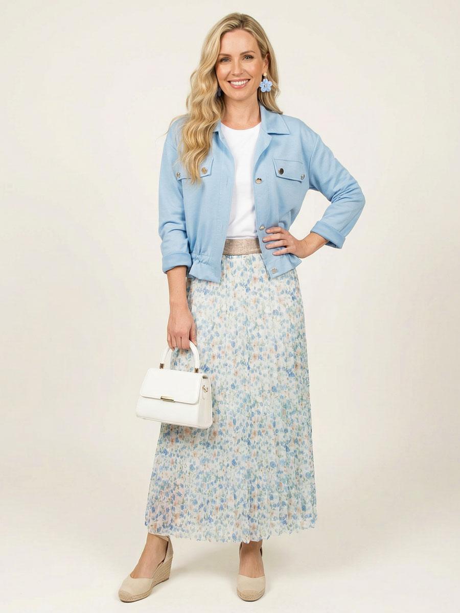 Deze plissé rok is een echte must-have voor je garderobe. De fijne plooien geven de rok een speelse en vrouwelijke uitstraling, terwijl de subtiele blauwe bloemenprint zorgt voor een frisse, romantische look. De elastische tailleband in goudkleurig glitterdetail geeft de rok net dat beetje extra glamour én zorgt voor een comfortabele pasvorm. Dankzij de iets kortere onderrok hoef je je geen zorgen te maken over doorschijnen en valt de rok mooi soepel om het lichaam.