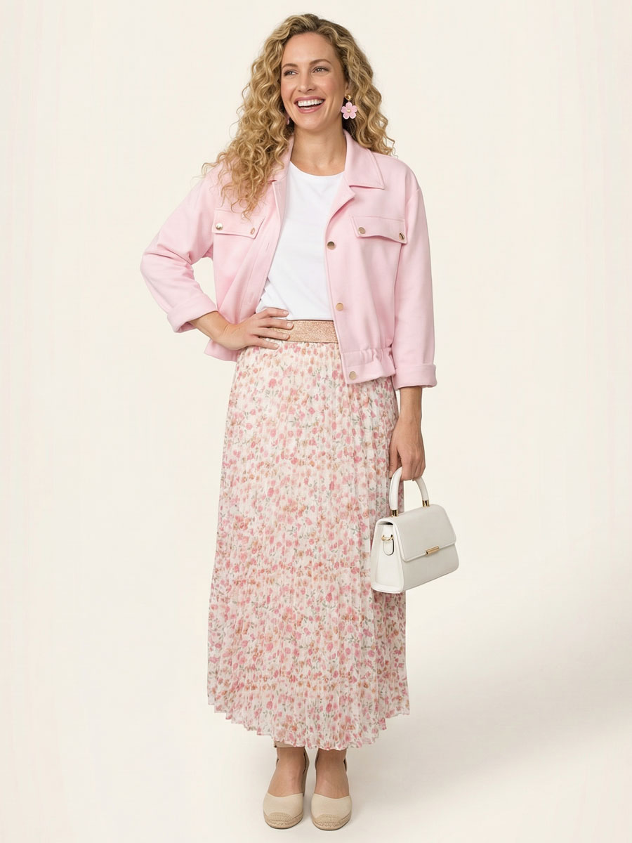 Deze plissé rok is een echte must-have voor je garderobe. De fijne plooien geven de rok een speelse en vrouwelijke uitstraling, terwijl de subtiele roze bloemenprint zorgt voor een frisse, romantische look. De elastische tailleband in goudkleurig glitterdetail geeft de rok net dat beetje extra glamour én zorgt voor een comfortabele pasvorm. Dankzij de iets kortere onderrok hoef je je geen zorgen te maken over doorschijnen en valt de rok mooi soepel om het lichaam.
