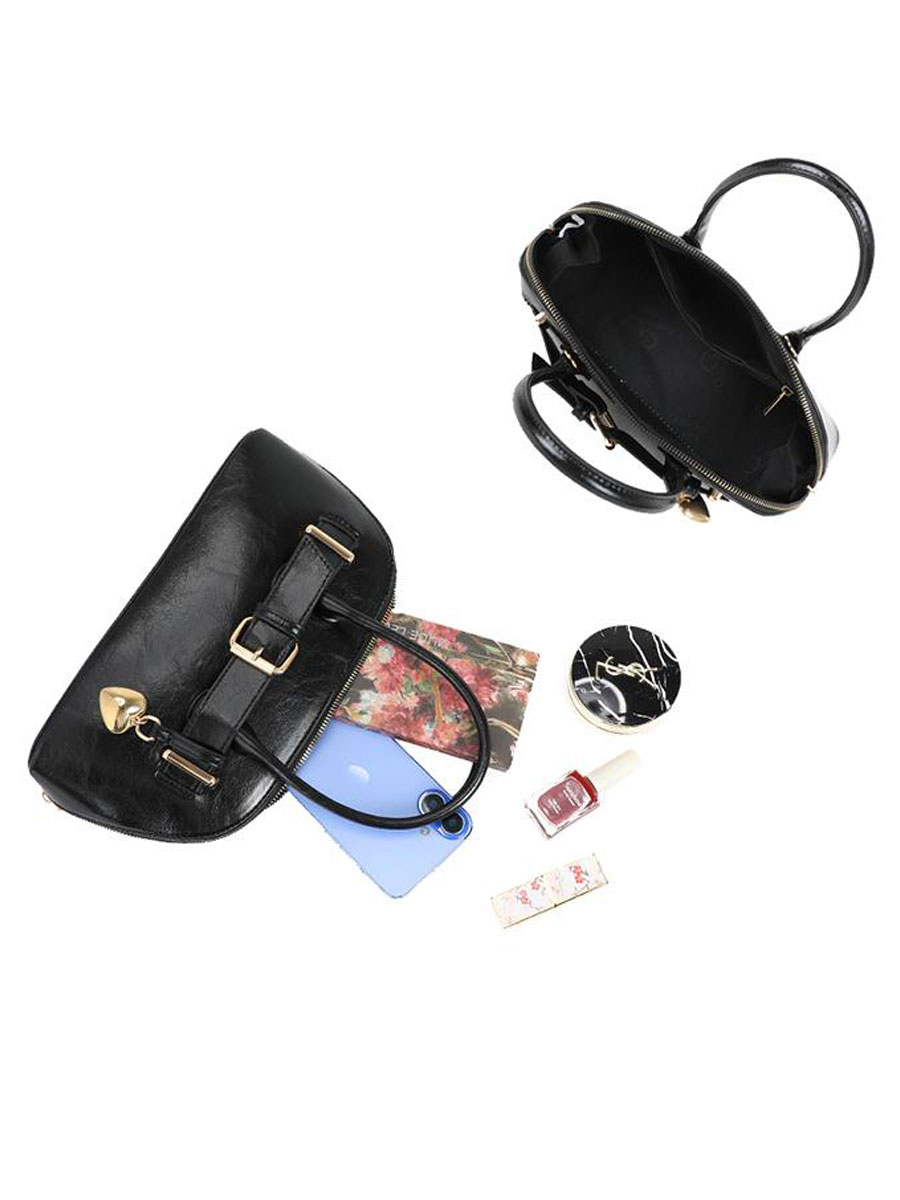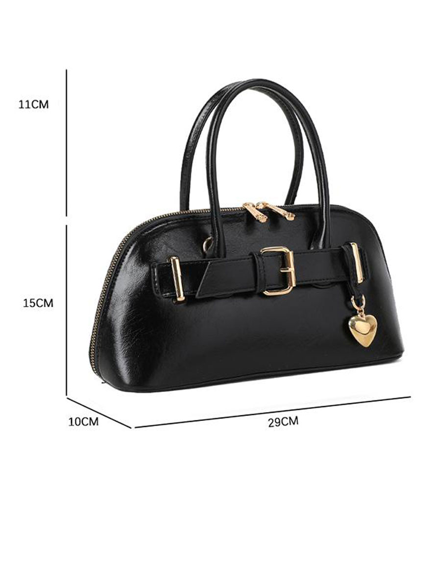 Deze mooie zwarte schoudertas heeft aan de voorkant een goudkleurige siergesp met hartjeshanger. De tas heeft een verstelbare en afneembare schouderband zodat je hem ook als handtas kan dragen. De tas sluit met een ritssluiting. Binnenin heeft het een open vak en een klein vakje met ritssluiting.