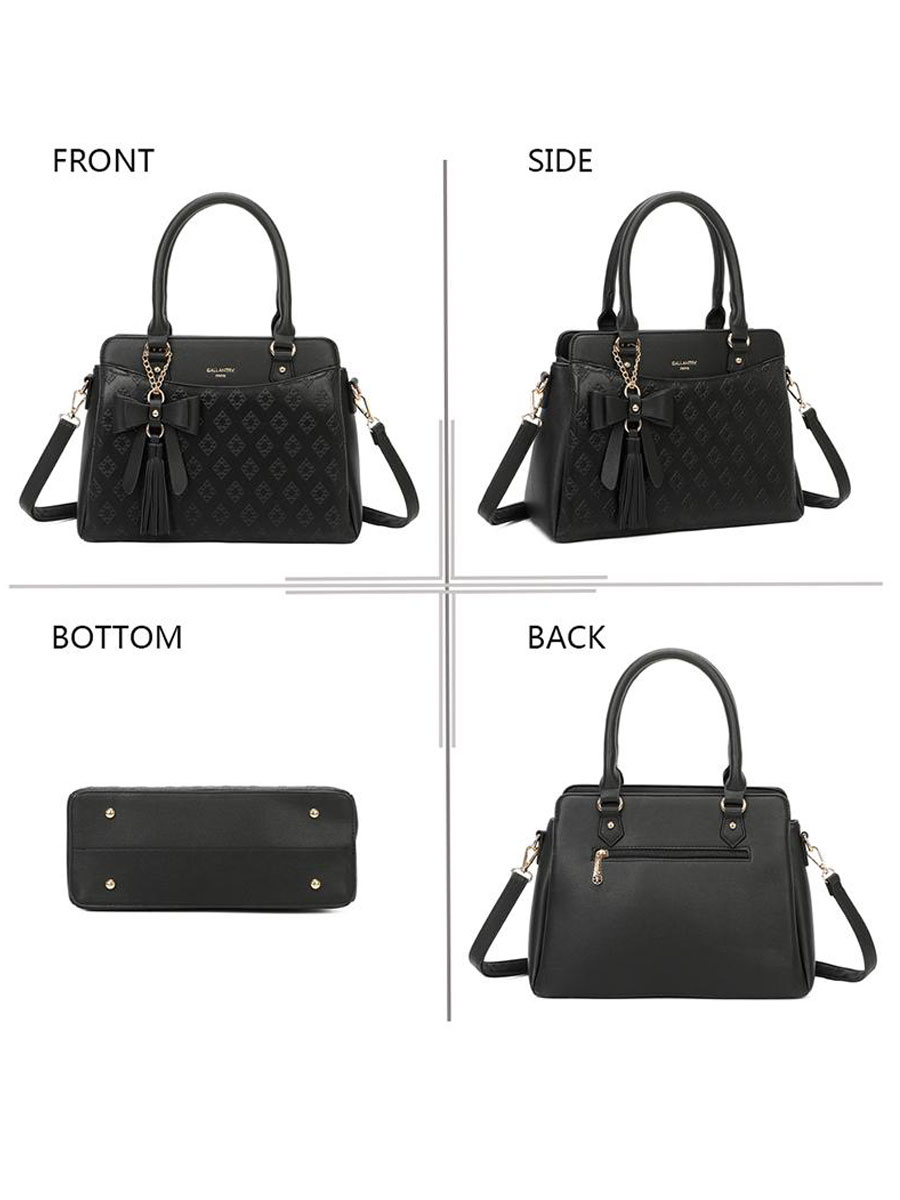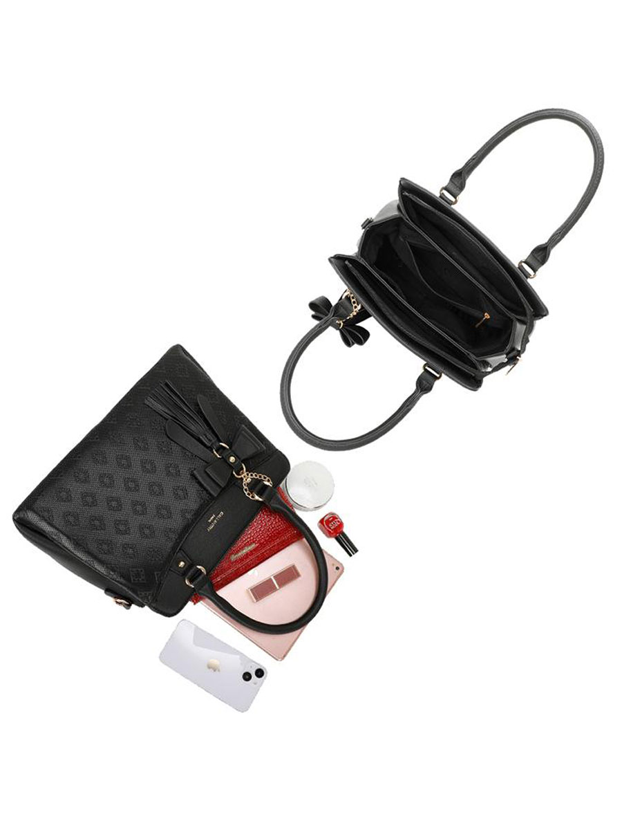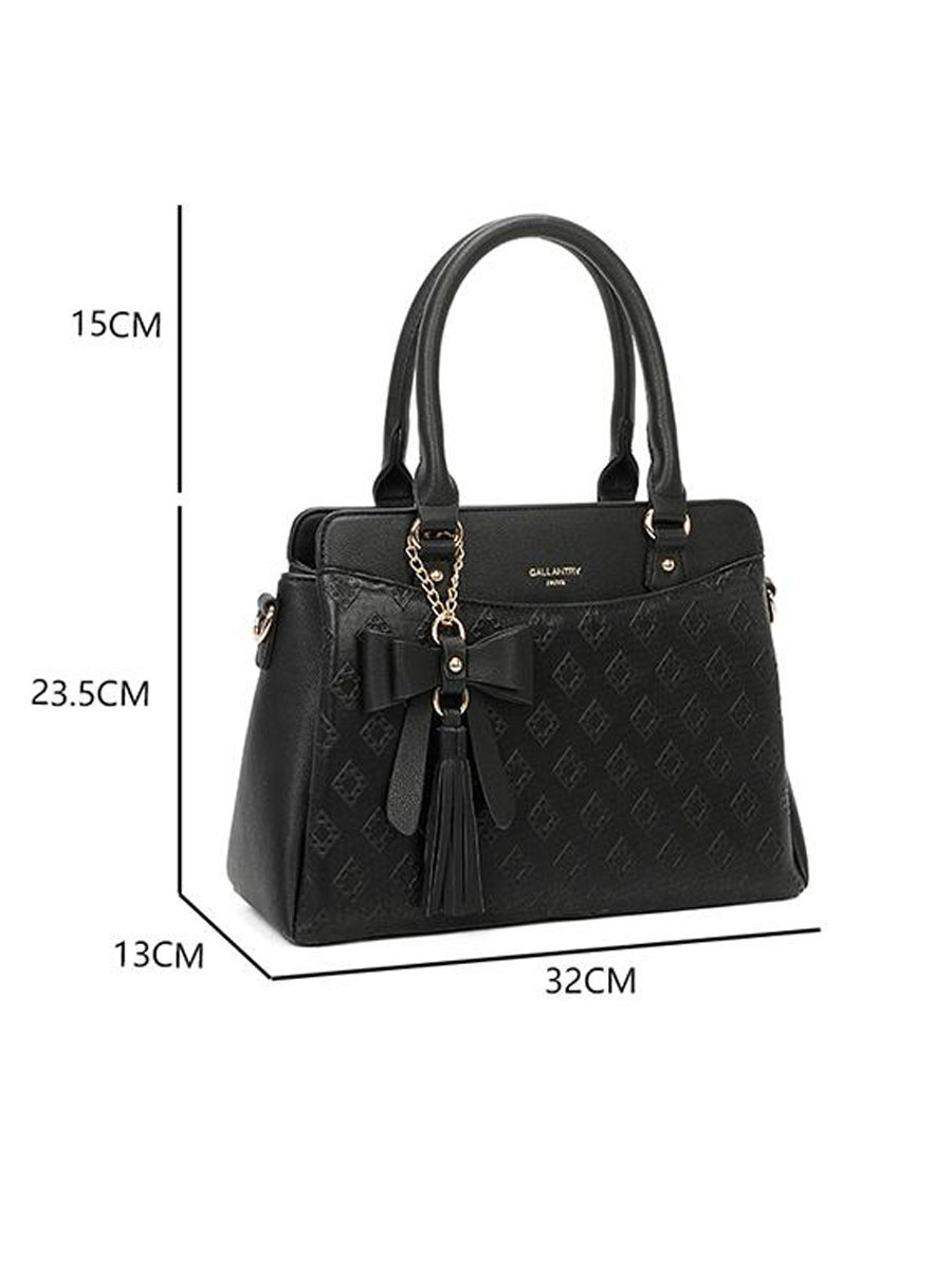 Deze prachtige zwarte tas heeft aan de voorkant een reliëfpatroon wat de tas een luxe uitstraling geeft. De hanger met sierlijke strik en speels kwastje aan de voorzijde zorgt voor een charmant en vrouwelijk accent. De tas is uitgevoerd in een stevig model dat mooi in vorm blijft. Dankzij de dubbele handvatten draag je haar stijlvol in de hand, terwijl de afneembare en verstelbare schouderband zorgt voor extra comfort wanneer je de tas liever over de schouder draagt. De 3 ruime hoofdvakken bieden voldoende plek voor al je dagelijkse essentials zoals je telefoon, portemonnee, sleutels en make-up. Ideaal voor werk, een dagje uit of een etentje.