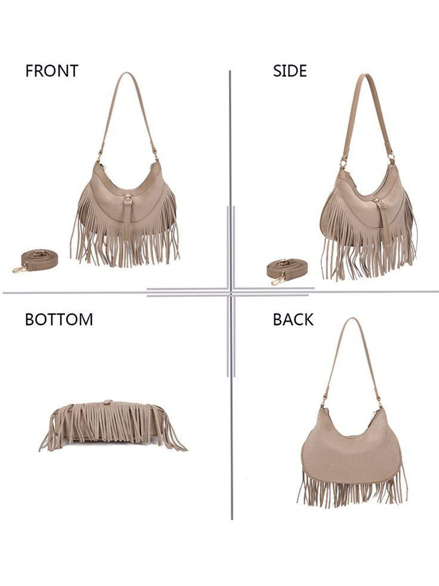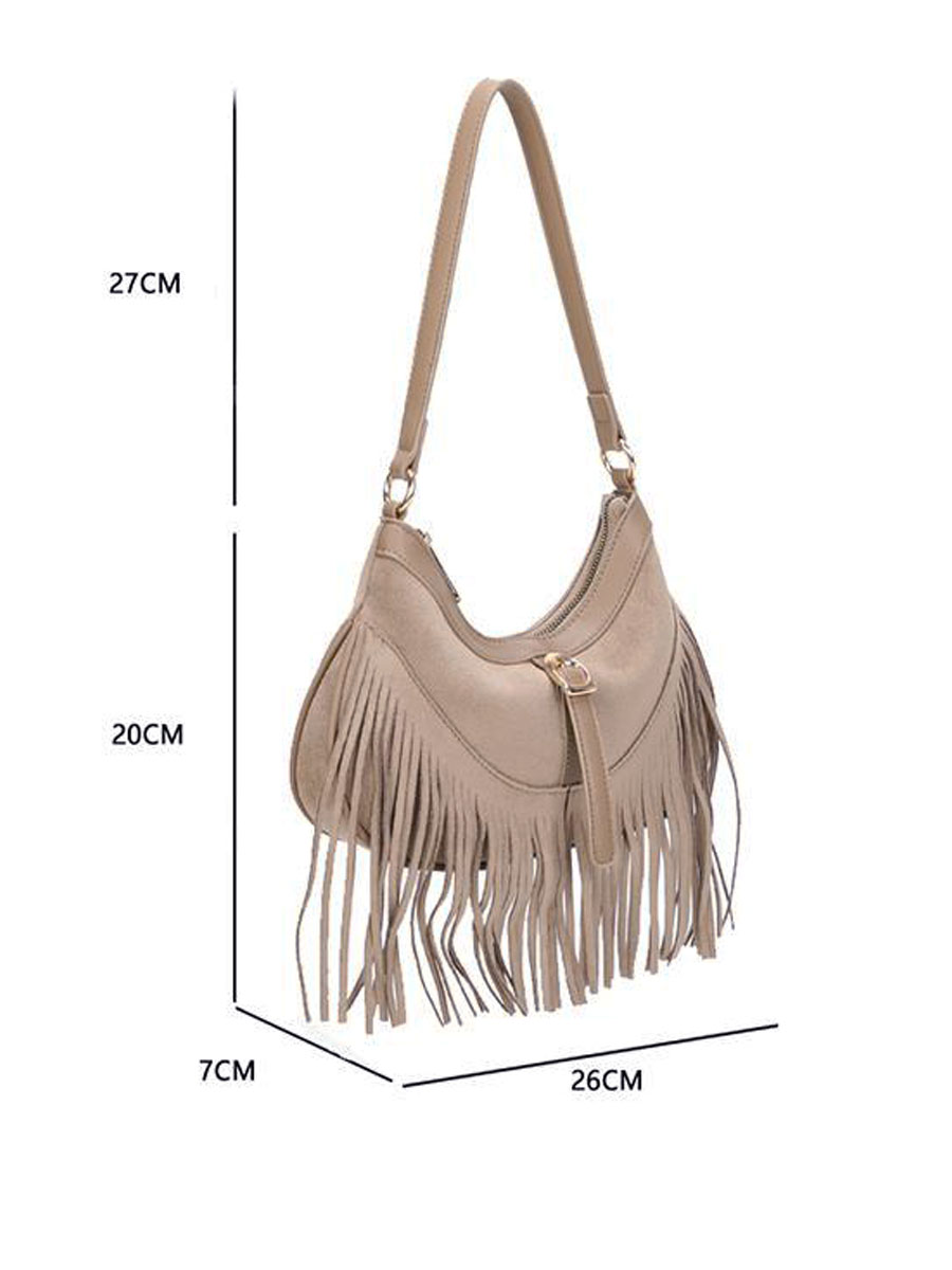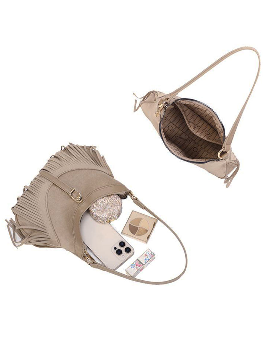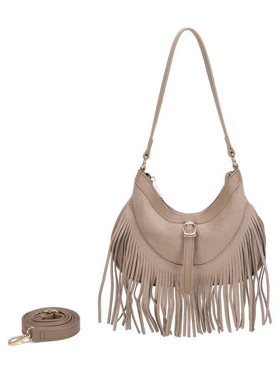 Deze taupekleurige suéde look schoudertas in boho stijl is de perfecte mix van stijl en speelsheid. De zwierige franjes geven de tas een nonchalante, bohemian look en maken van dit item een echte eyecatcher bij elke outfit. De tas sluit met een ritssluiting, zodat je spullen veilig opgeborgen zijn. Binnenin vind je een handig ritsvak en een open vakje, ideaal om je essentials georganiseerd mee te nemen. Dankzij de extra verstelbare en afneembare schouderband draag je de tas zowel over de schouder als crossbody – precies zoals jij wilt. Perfect te combineren met een flowy jurk of rok voor die typische boho vibe.