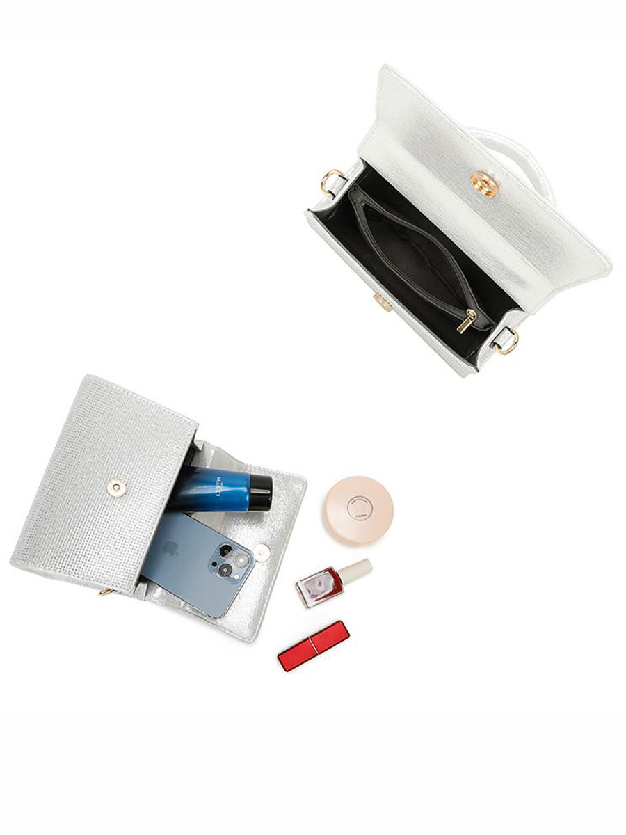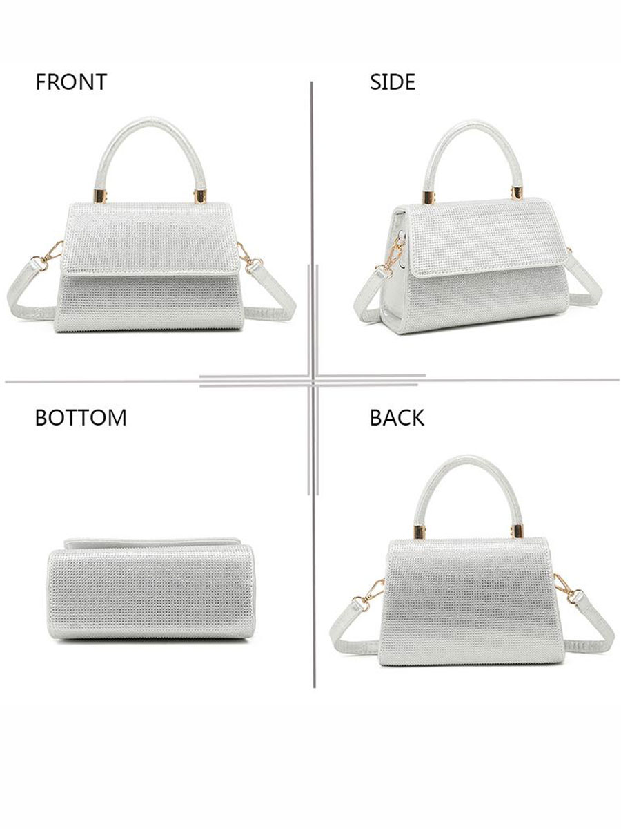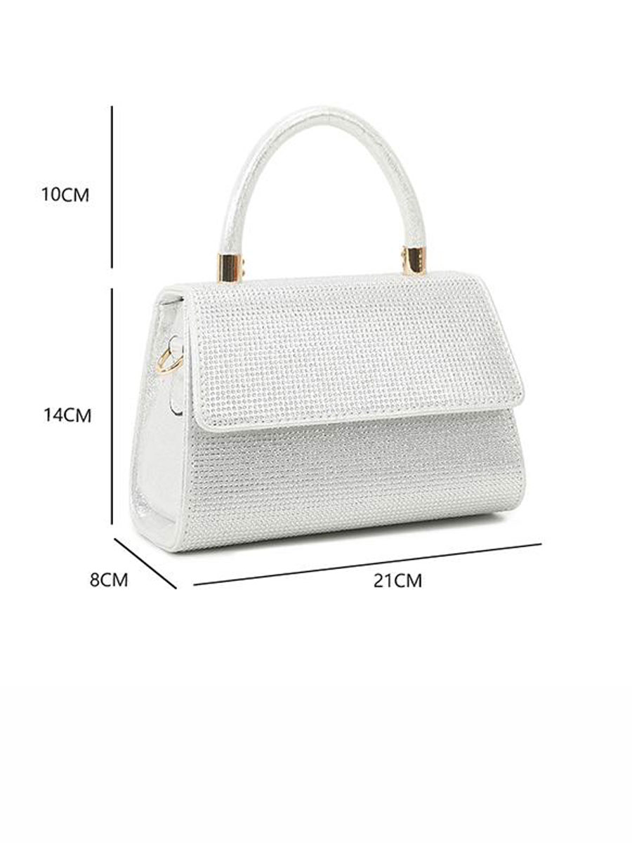 Deze feestelijke zilverkleurige schoudertas is bezet met glinsterende strassteentjes. De tas heeft een verstelbare en afneembare schouderband zodat je hem ook als handtas kan dragen. De tas heeft een magneetsluiting en heeft binnenin twee open vakken en eentje met een ritssluiting.