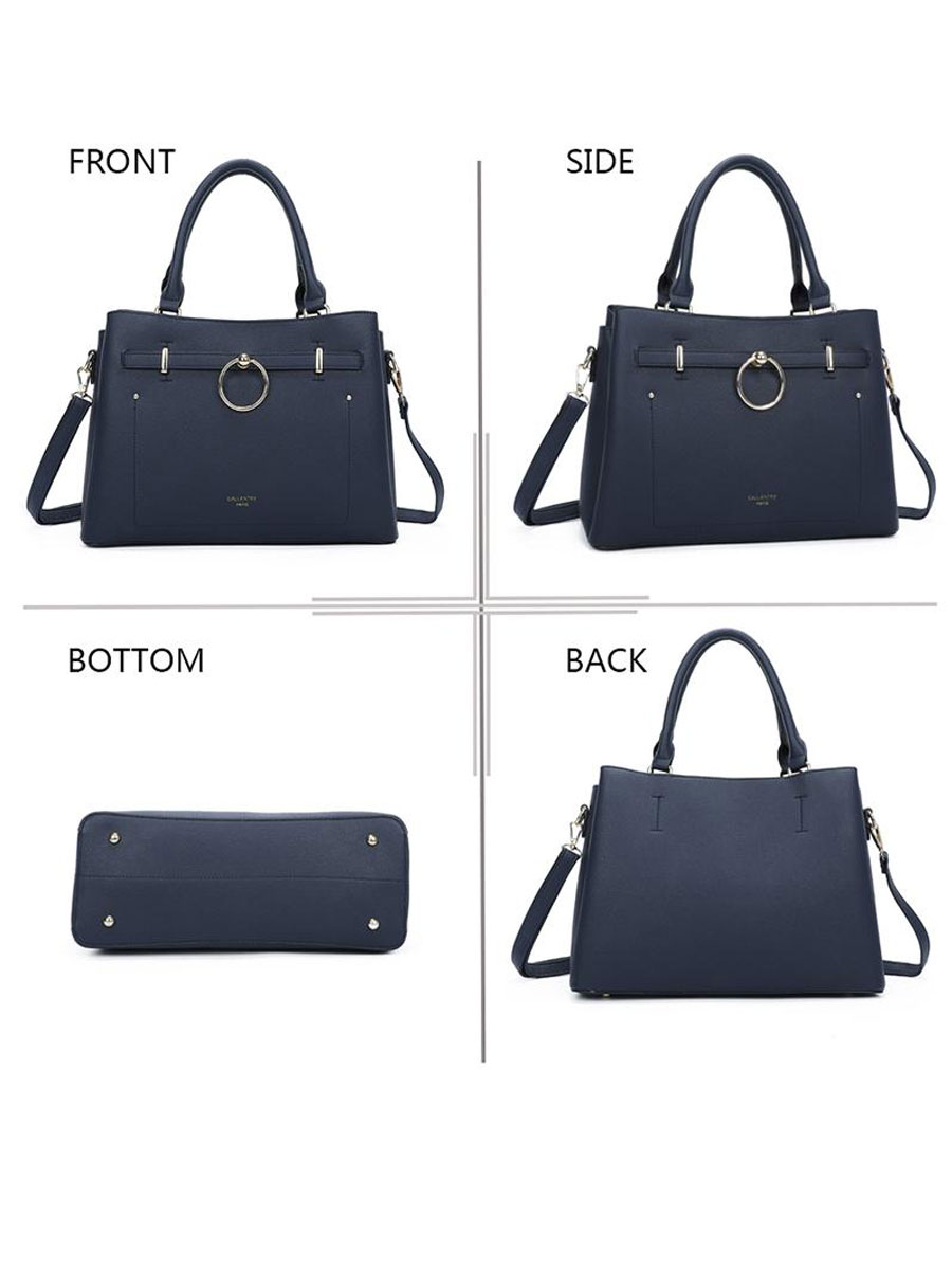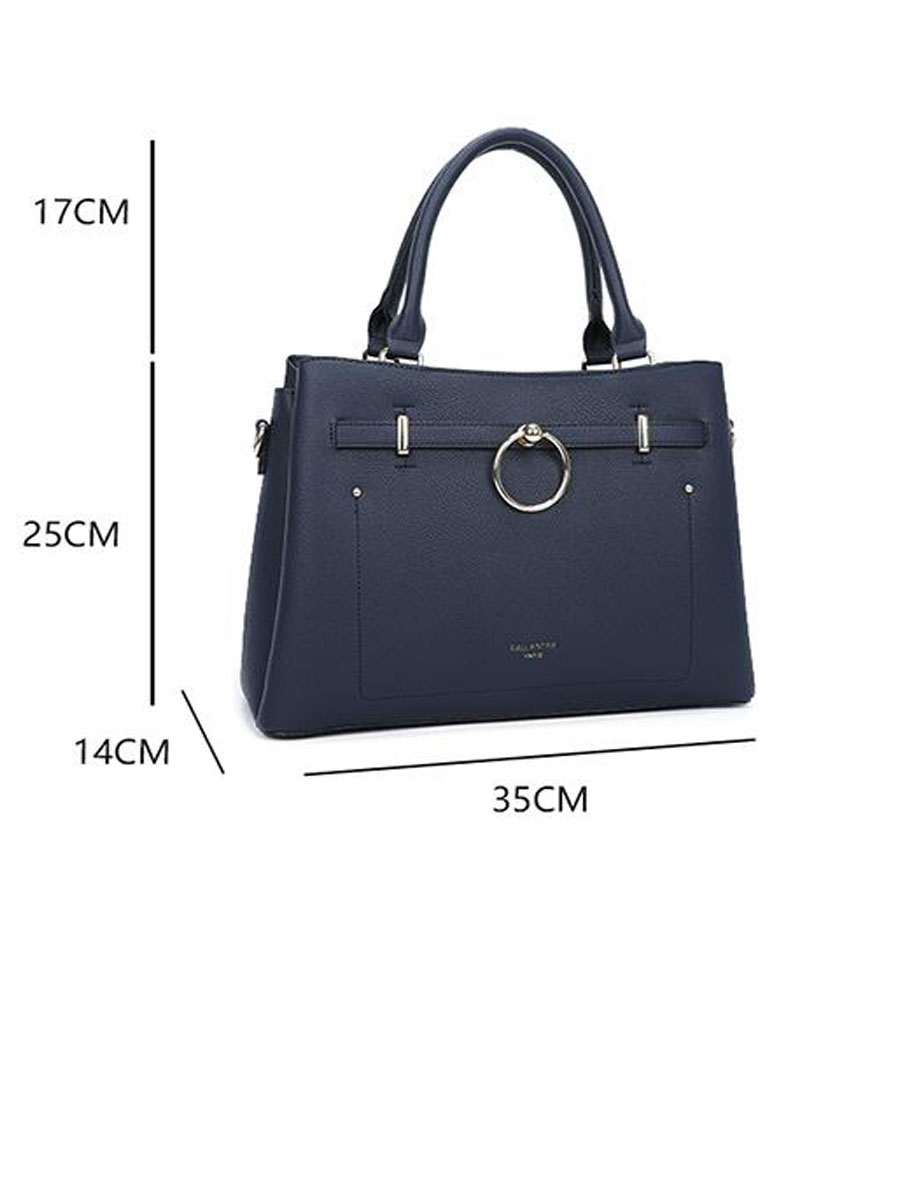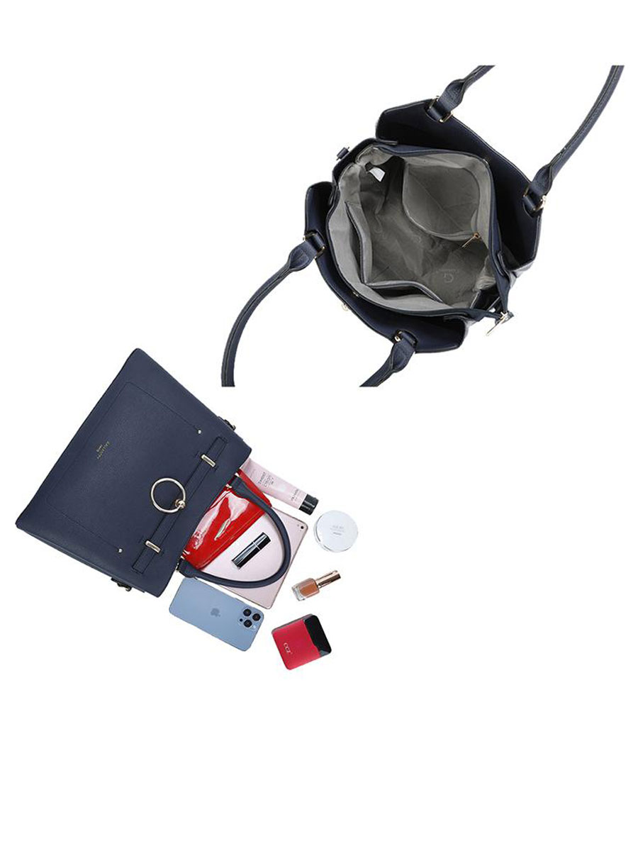 Elegantie en functionaliteit komen samen in deze prachtige handtas in een donkerblauwe kleur. De tas is vervaardigd van hoogwaardig imitatieleer met een subtiele structuur, wat zorgt voor een luxe uitstraling en duurzame kwaliteit. De goudkleurige details – waaronder de opvallende ring aan de voorzijde – geven deze tas een chique en moderne look. Dankzij de stevige dubbele handvatten en de afneembare, verstelbare schouderriem kun je de tas zowel in de hand als schouder dragen. Het ruime hoofdvak sluit veilig met een rits en biedt voldoende ruimte voor al je dagelijkse essentials. Binnenin vind je meerdere vakken om je spullen overzichtelijk op te bergen, zoals je telefoon, sleutels en make-up. De twee grote vakken ernaast hebben een magneetsluiting.