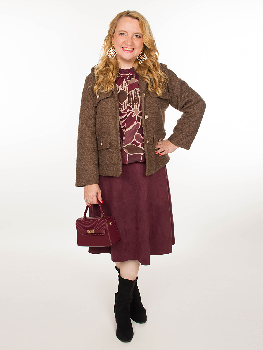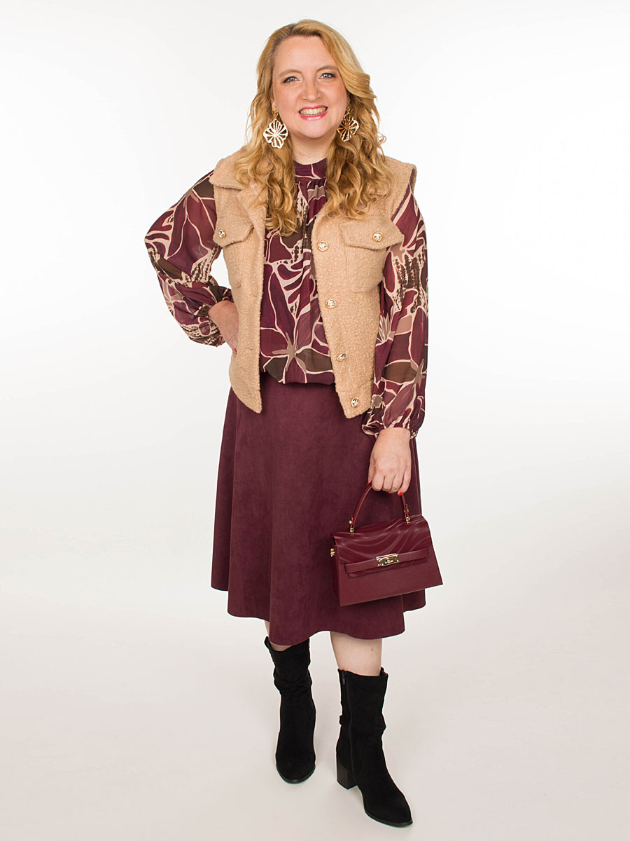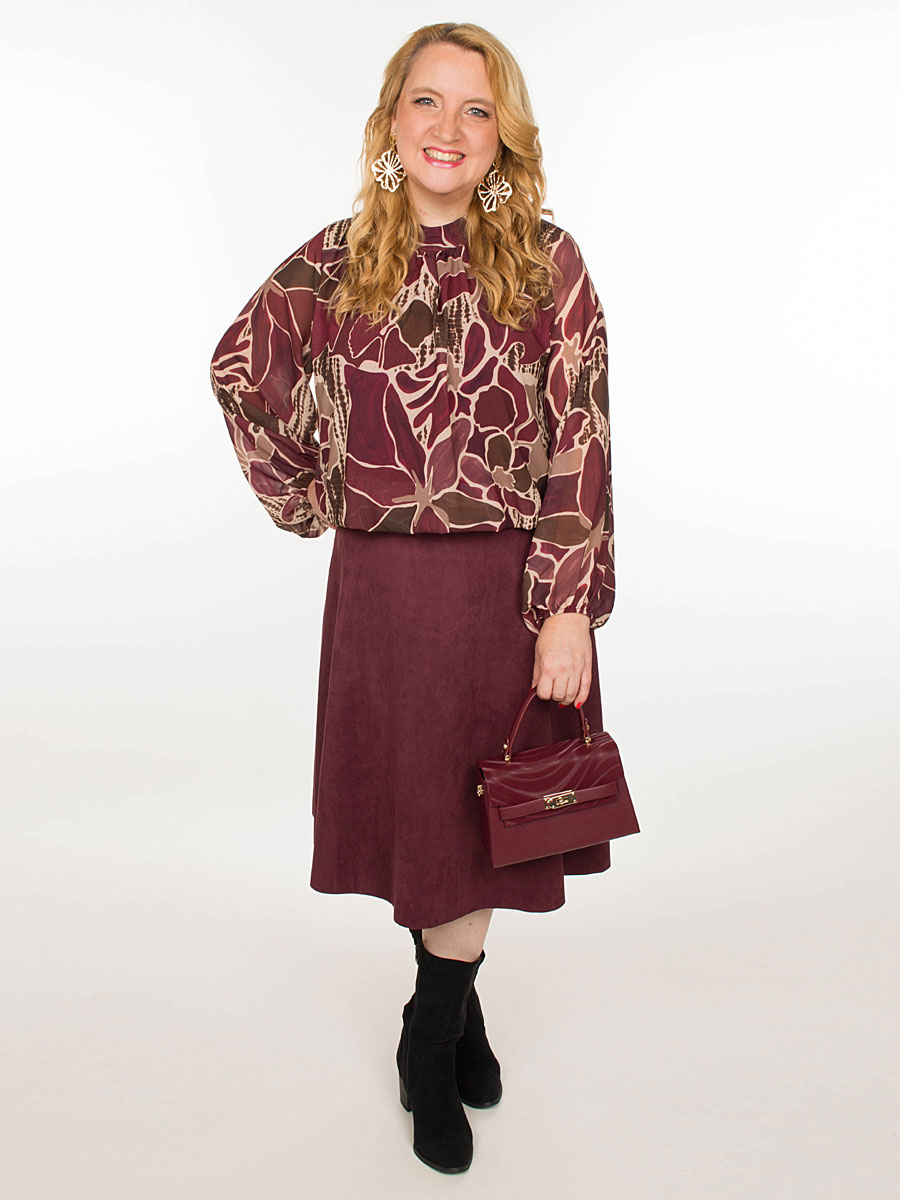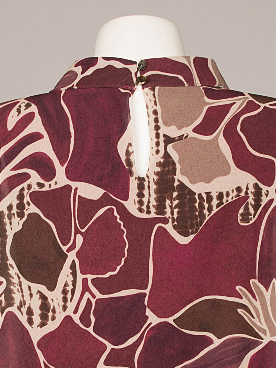 Deze bloezende top in bordeaux combineert stijl en comfort in één. Het dessin in bruin en beige geven een vrouwelijke en elegante uitstraling. Dankzij het elastische boord aan de onderzijde valt de blouse mooi bloezend en blijft hij perfect op zijn plaats. De top heeft een stijlvol staand kraagje waarbij de achterzijde een speelse opening heeft die sluit met 2 knoopjes. De soepelvallende stof en de lange mouwen met elastisch boord zorgen voor een heerlijk draagcomfort. De blouse is gevoerd met een mouwloze top van viscose en is one size te dragen voor maten S (36) t/m XXL (44).