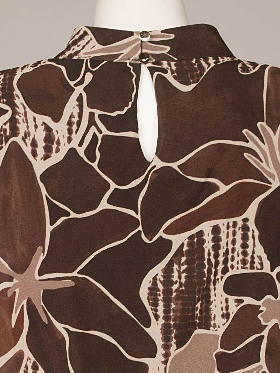 Deze bloezende top in bruin combineert stijl en comfort in één. Het dessin in bruin en beige geven een vrouwelijke en elegante uitstraling. Dankzij het elastische boord aan de onderzijde valt de blouse mooi bloezend en blijft hij perfect op zijn plaats. De top heeft een stijlvol staand kraagje waarbij de achterzijde een speelse opening heeft die sluit met 2 knoopjes. De soepelvallende stof en de lange mouwen met elastisch boord zorgen voor een heerlijk draagcomfort. De blouse is gevoerd met een mouwloze top van viscose en is one size te dragen voor maten S (36) t/m XXL (44).
