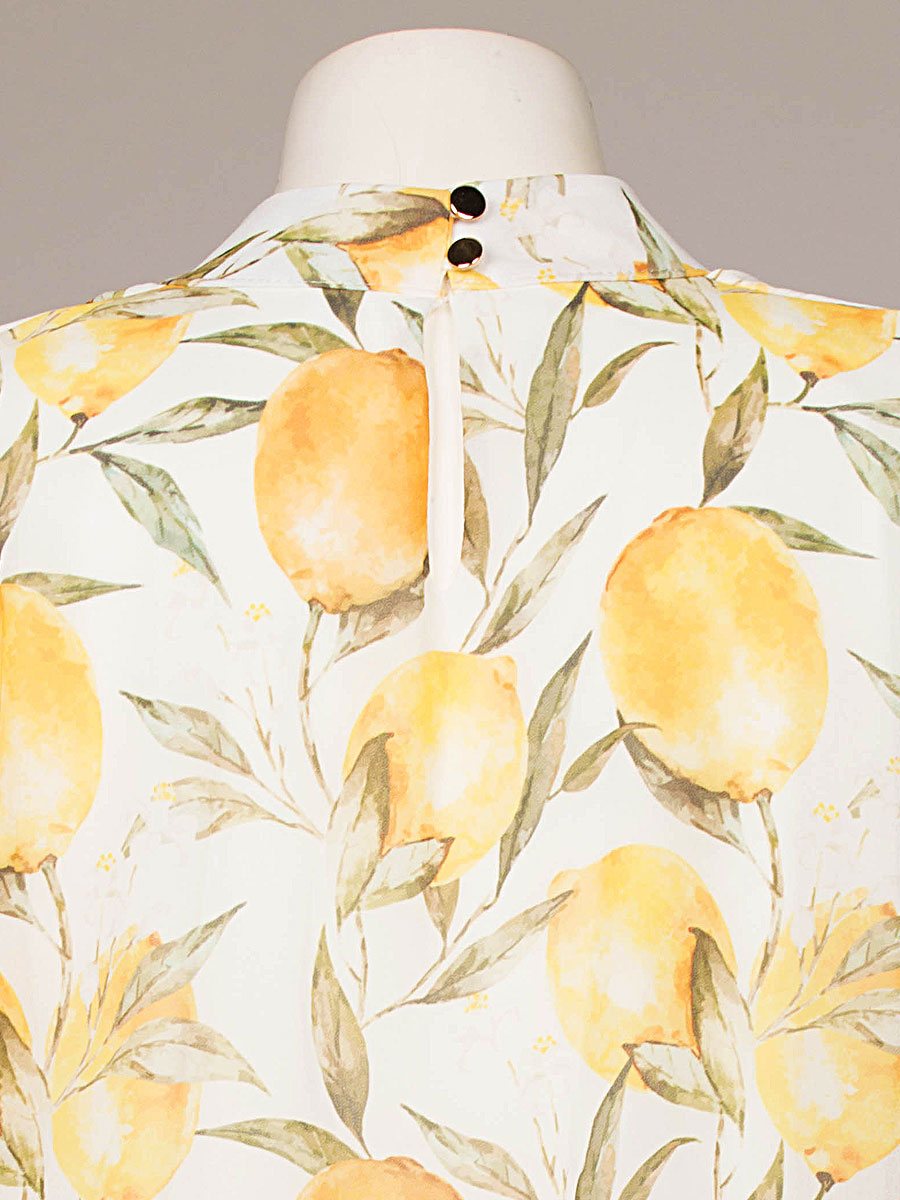 Deze korte bloezende top combineert stijl en comfort in één elegante look. Het grafisch citroendessin geeft de blouse een vrouwelijke, frisse uitstraling die perfect past bij zowel een casual als een geklede outfit. Dankzij het elastische boord aan de onderzijde valt de blouse mooi bloezend en blijft hij perfect op zijn plaats zitten. Het stijlvolle staande kraagje geeft een verfijnde touch, terwijl de speelse opening aan de achterzijde – gesloten met twee knoopjes – zorgt voor een subtiel, charmant detail. De soepelvallende stof en de korte, zwierige mouwtjes bieden een heerlijk draagcomfort en een luchtig gevoel. De blouse is bovendien gevoerd met een mouwloze top van viscose, waardoor hij niet doorschijnt en extra prettig aanvoelt op de huid.