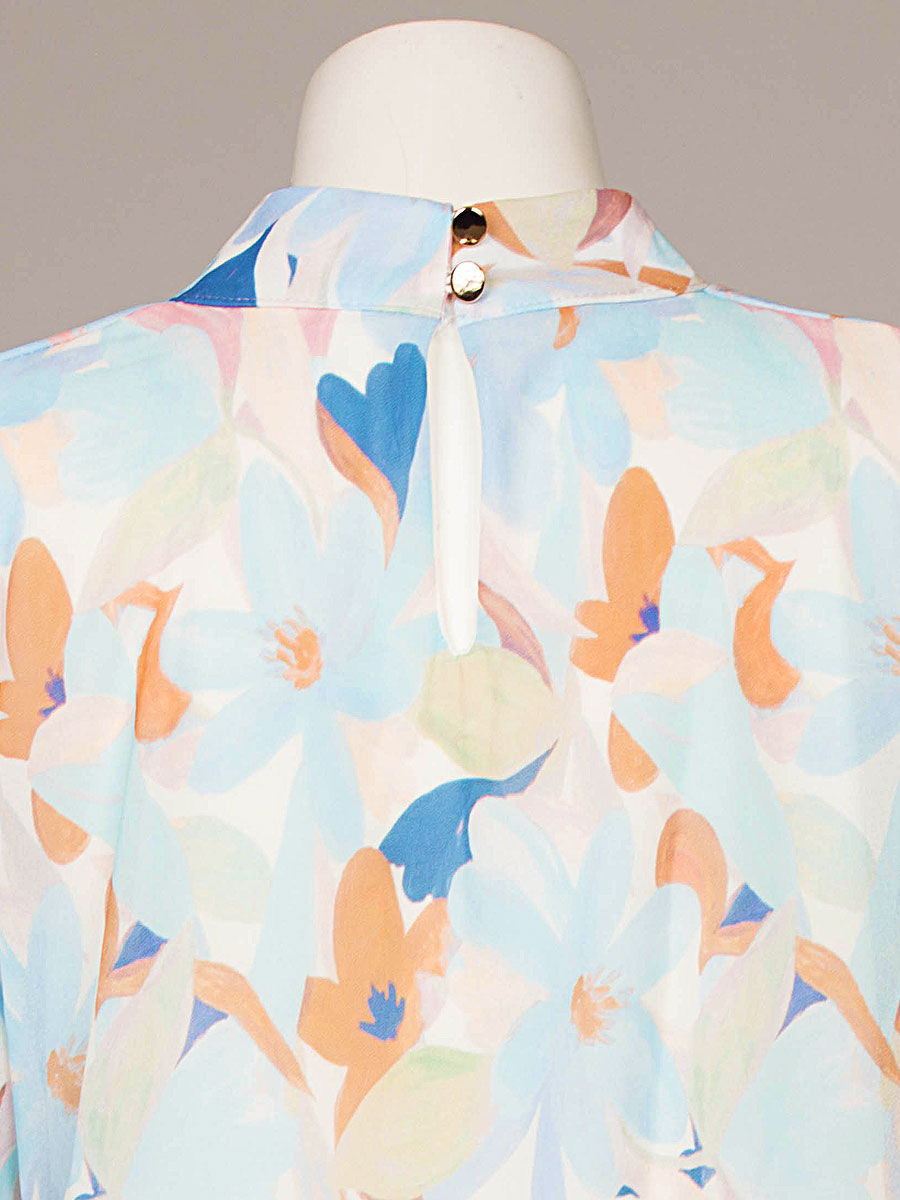 Deze korte bloezende top combineert stijl en comfort in één elegante look. Het grafisch bloemdessin in blauw geeft de blouse een vrouwelijke, frisse uitstraling die perfect past bij zowel een casual als een geklede outfit. Dankzij het elastische boord aan de onderzijde valt de blouse mooi bloezend en blijft hij perfect op zijn plaats zitten. Het stijlvolle staande kraagje geeft een verfijnde touch, terwijl de speelse opening aan de achterzijde – gesloten met twee knoopjes – zorgt voor een subtiel, charmant detail. De soepelvallende stof en de korte, zwierige mouwtjes bieden een heerlijk draagcomfort en een luchtig gevoel. De blouse is bovendien gevoerd met een mouwloze top van viscose, waardoor hij niet doorschijnt en extra prettig aanvoelt op de huid.