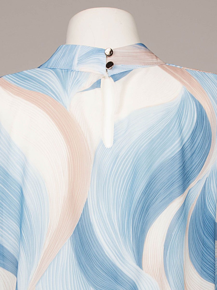 Deze korte bloezende top combineert stijl en comfort in één elegante look. Het grafisch dessin in blauw geeft de blouse een vrouwelijke, frisse uitstraling die perfect past bij zowel een casual als een geklede outfit. Dankzij het elastische boord aan de onderzijde valt de blouse mooi bloezend en blijft hij perfect op zijn plaats zitten. Het stijlvolle staande kraagje geeft een verfijnde touch, terwijl de speelse opening aan de achterzijde – gesloten met twee knoopjes – zorgt voor een subtiel, charmant detail. De soepelvallende stof en de korte, zwierige mouwtjes bieden een heerlijk draagcomfort en een luchtig gevoel. De blouse is bovendien gevoerd met een mouwloze top van viscose, waardoor hij niet doorschijnt en extra prettig aanvoelt op de huid.