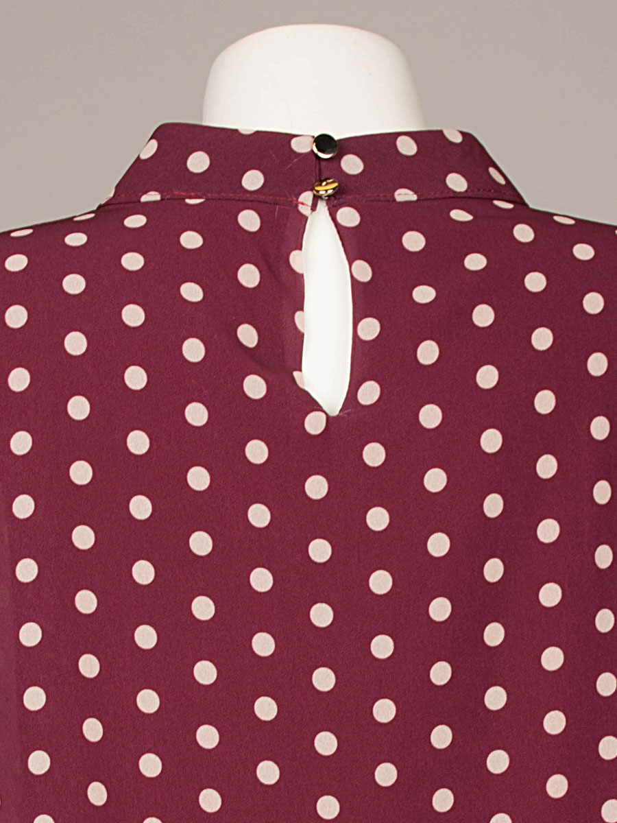 Deze bloezende top in bordeaux combineert stijl en comfort in één. Het stippendessin geeft een vrouwelijke en elegante uitstraling. Dankzij het elastische boord aan de onderzijde valt de blouse mooi bloezend en blijft hij perfect op zijn plaats. De top heeft een stijlvol staand kraagje waarbij de achterzijde een speelse opening heeft die sluit met 2 knoopjes. De soepelvallende stof en de lange mouwen met elastisch boord zorgen voor een heerlijk draagcomfort. De blouse is gevoerd met een mouwloze top van viscose en is one size te dragen voor maten S (36) t/m XXL (44).