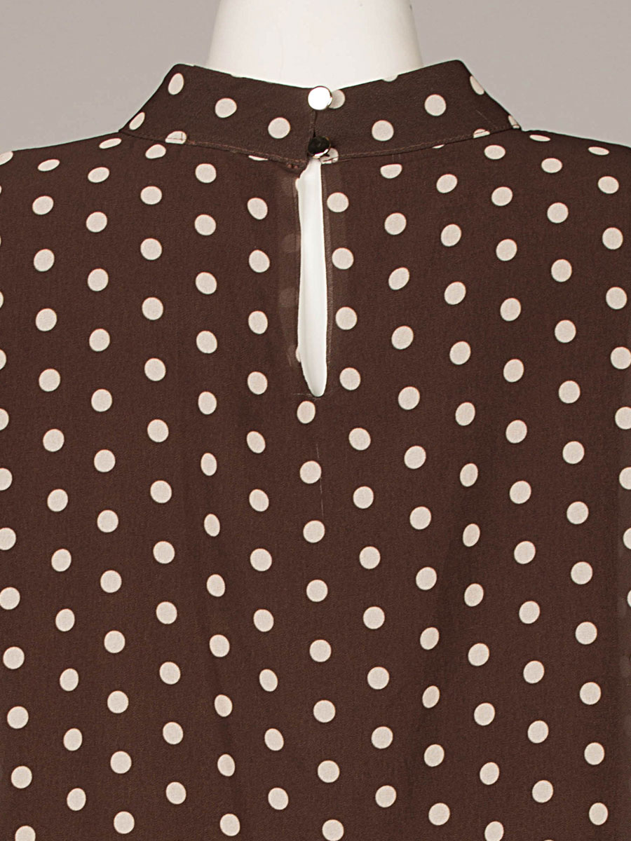 Deze bruine bloezende top combineert stijl en comfort in één. Het stippendessin in lichtbeige geeft een vrouwelijke en elegante uitstraling. Dankzij het elastische boord aan de onderzijde valt de blouse mooi bloezend en blijft hij perfect op zijn plaats. De top heeft een stijlvol staand kraagje waarbij de achterzijde een speelse opening heeft die sluit met 2 knoopjes. De soepelvallende stof en de lange mouwen met elastisch boord zorgen voor een heerlijk draagcomfort. De blouse is gevoerd met een mouwloze top van viscose en is one size te dragen voor maten S (36) t/m XXL (44).