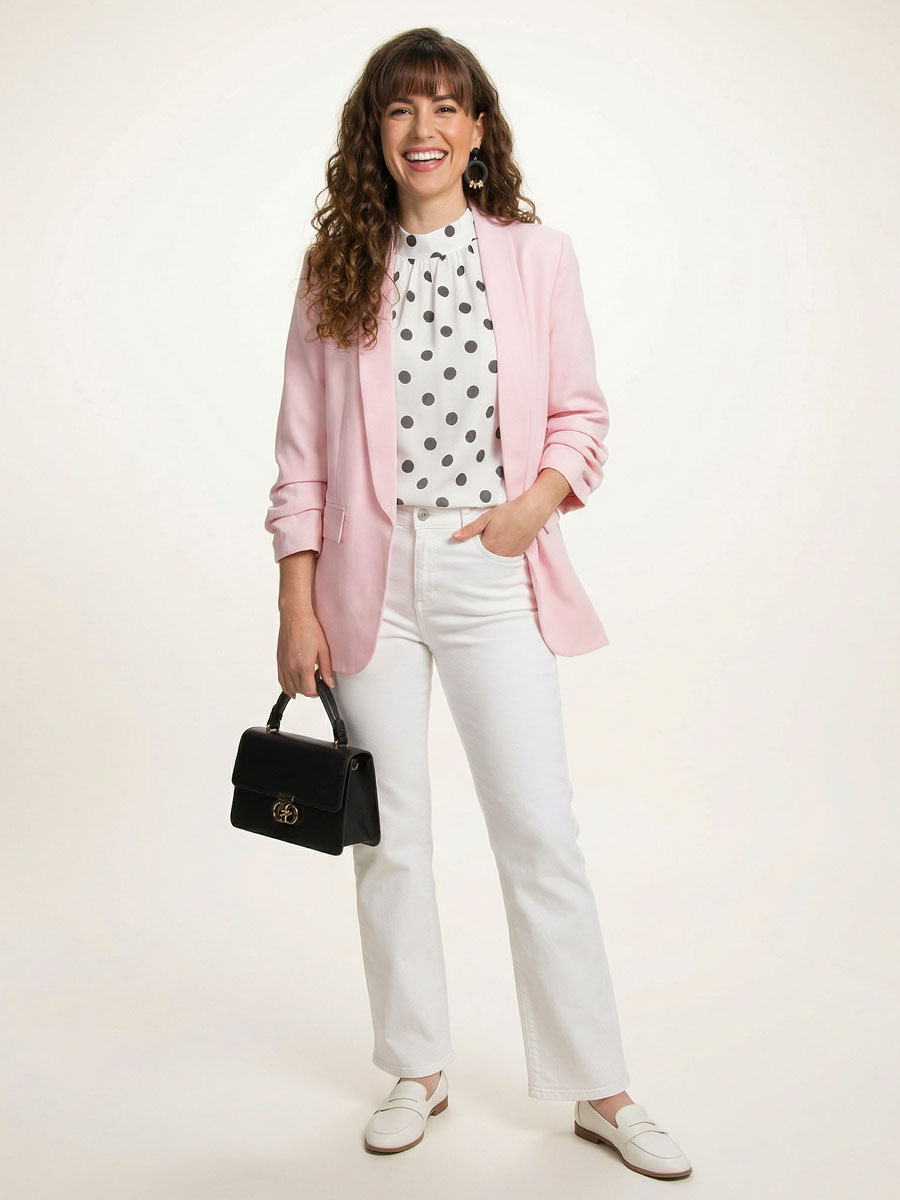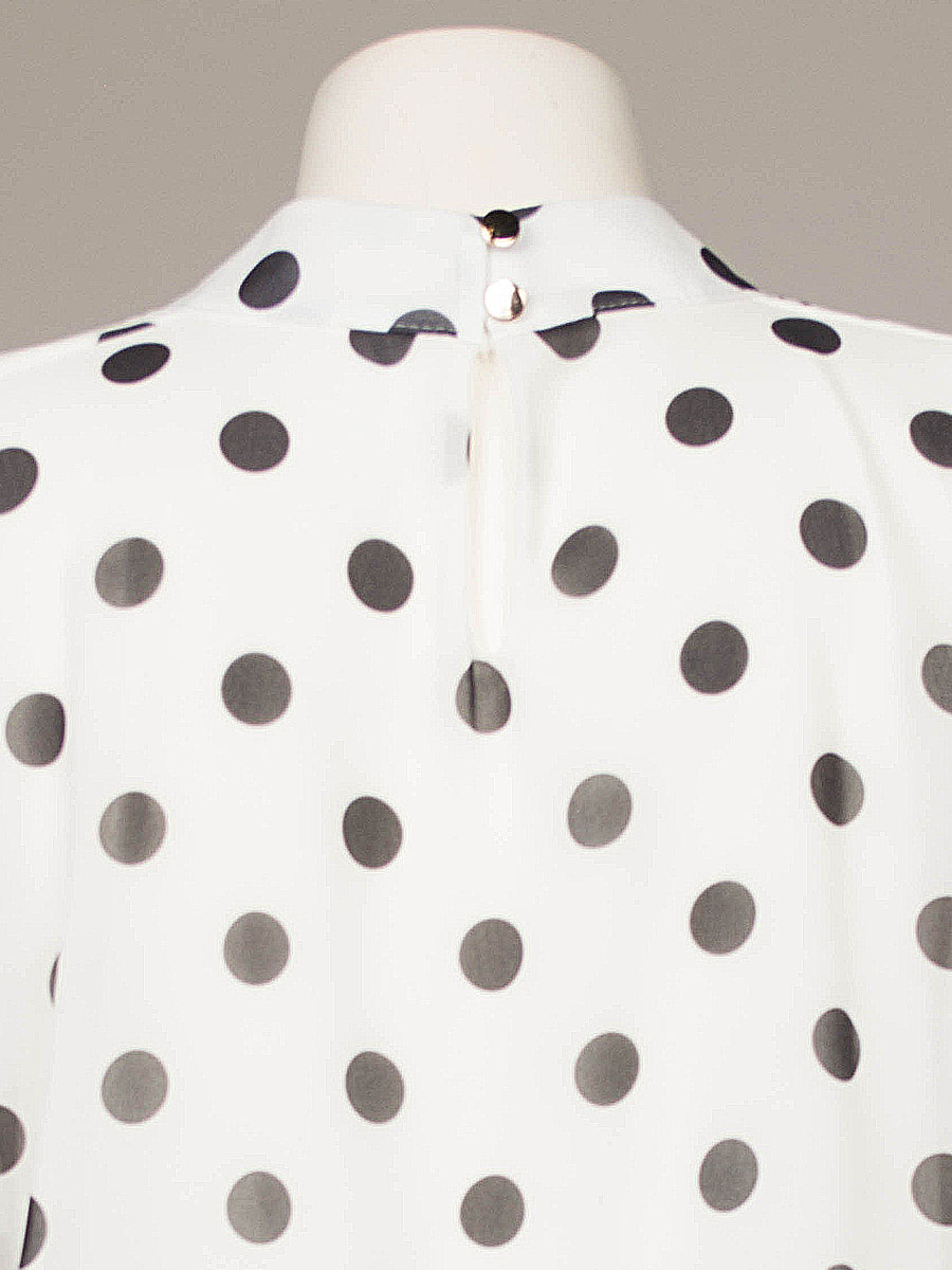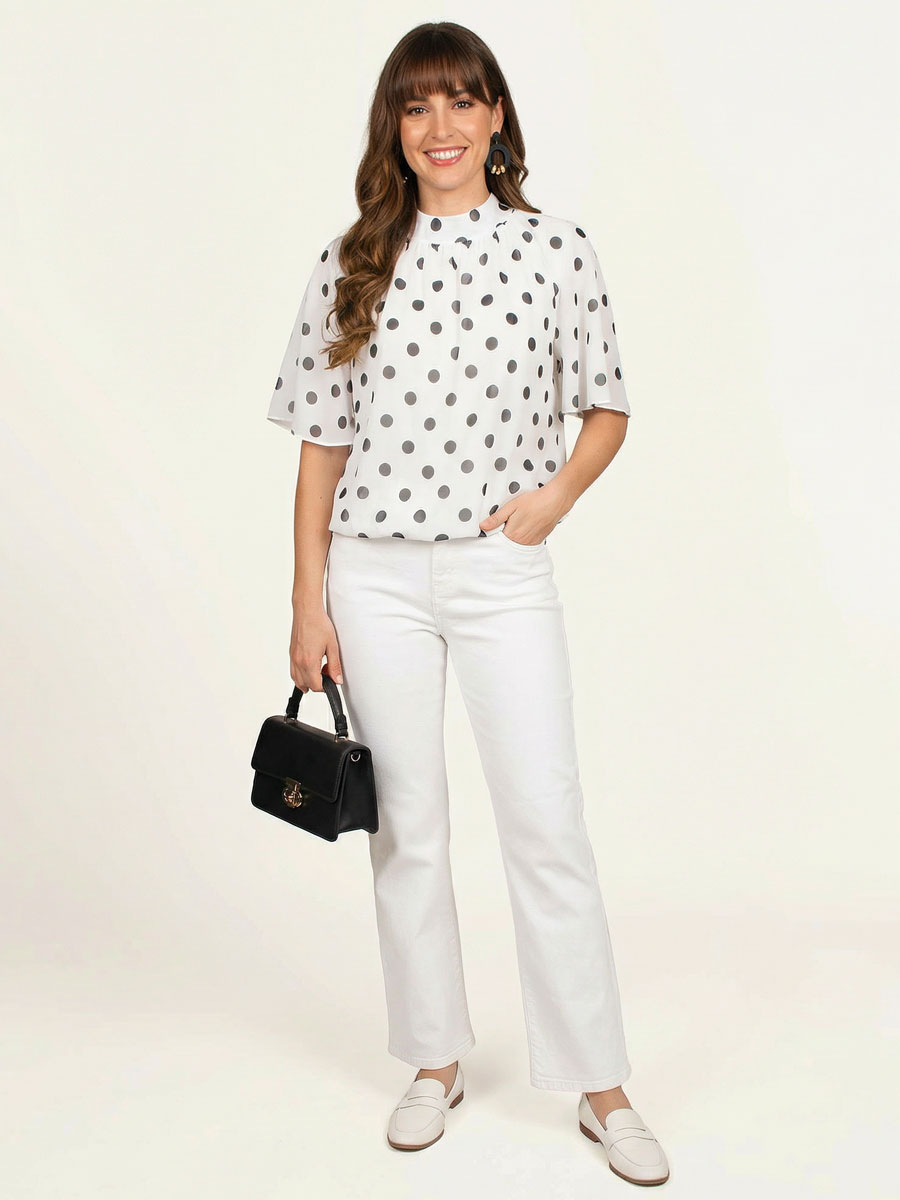 Deze korte bloezende top combineert stijl en comfort in één elegante look. Het zwarte stippendessin op een lichte ondergrond geeft de blouse een vrouwelijke, frisse uitstraling die perfect past bij zowel een casual als een geklede outfit. Dankzij het elastische boord aan de onderzijde valt de blouse mooi bloezend en blijft hij perfect op zijn plaats zitten. Het stijlvolle staande kraagje geeft een verfijnde touch, terwijl de speelse opening aan de achterzijde – gesloten met twee knoopjes – zorgt voor een subtiel, charmant detail. De soepelvallende stof en de korte, zwierige mouwtjes bieden een heerlijk draagcomfort en een luchtig gevoel. De blouse is bovendien gevoerd met een mouwloze top van viscose, waardoor hij niet doorschijnt en extra prettig aanvoelt op de huid.